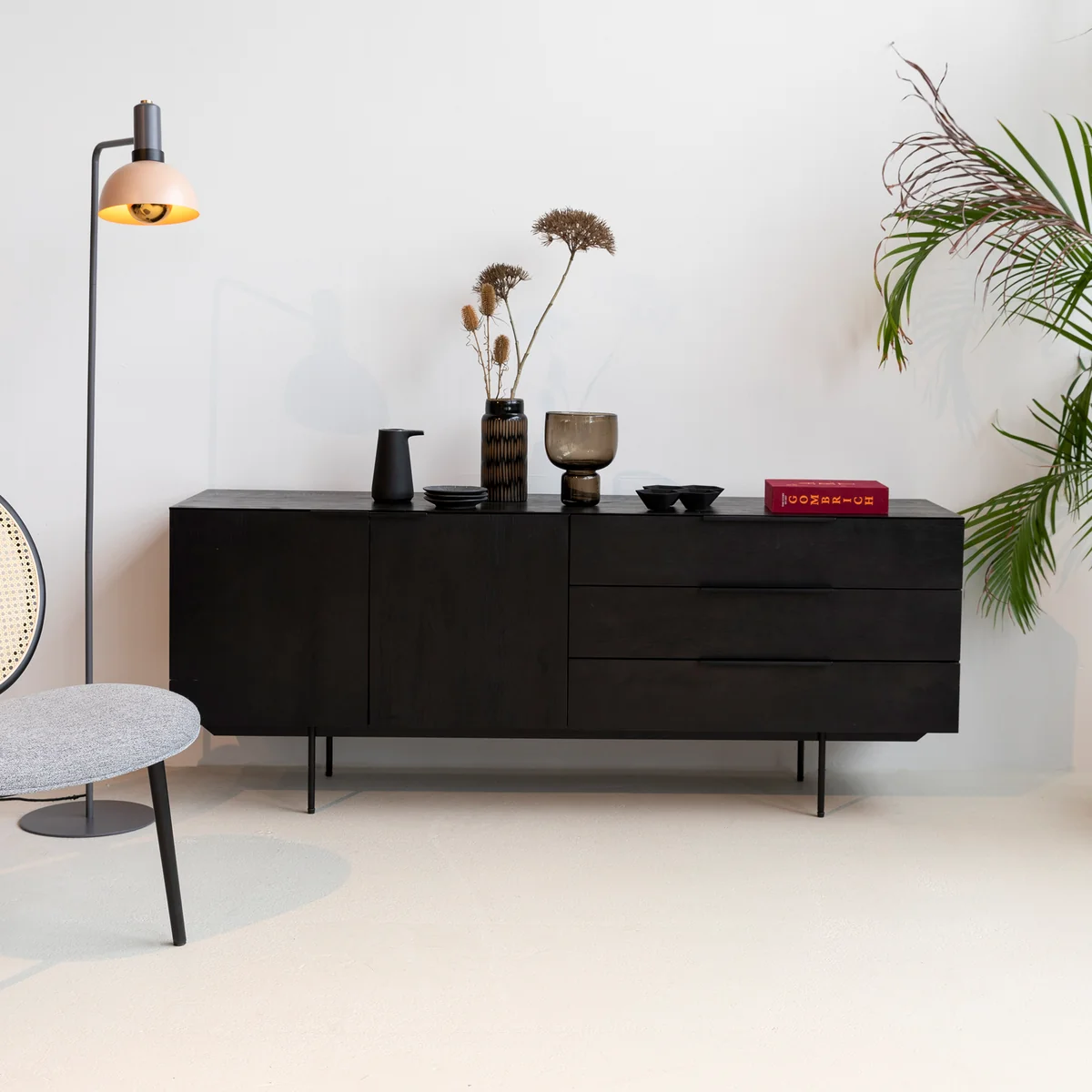 Met een breedte van 180 cm, een diepte van 45 cm en een hoogte van 70,5 cm biedt het dressoir royale opbergruimte voor serviesgoed, boeken, documenten of decoratieve elementen. Het heeft drie ruime laden met een soft-close functie en twee deuren met daarachter een legplank. De poten met een hoogte van 20 cm zorgen niet alleen voor een luchtige look, maar maken het ook makkelijker om onder het meubel schoon te maken.
