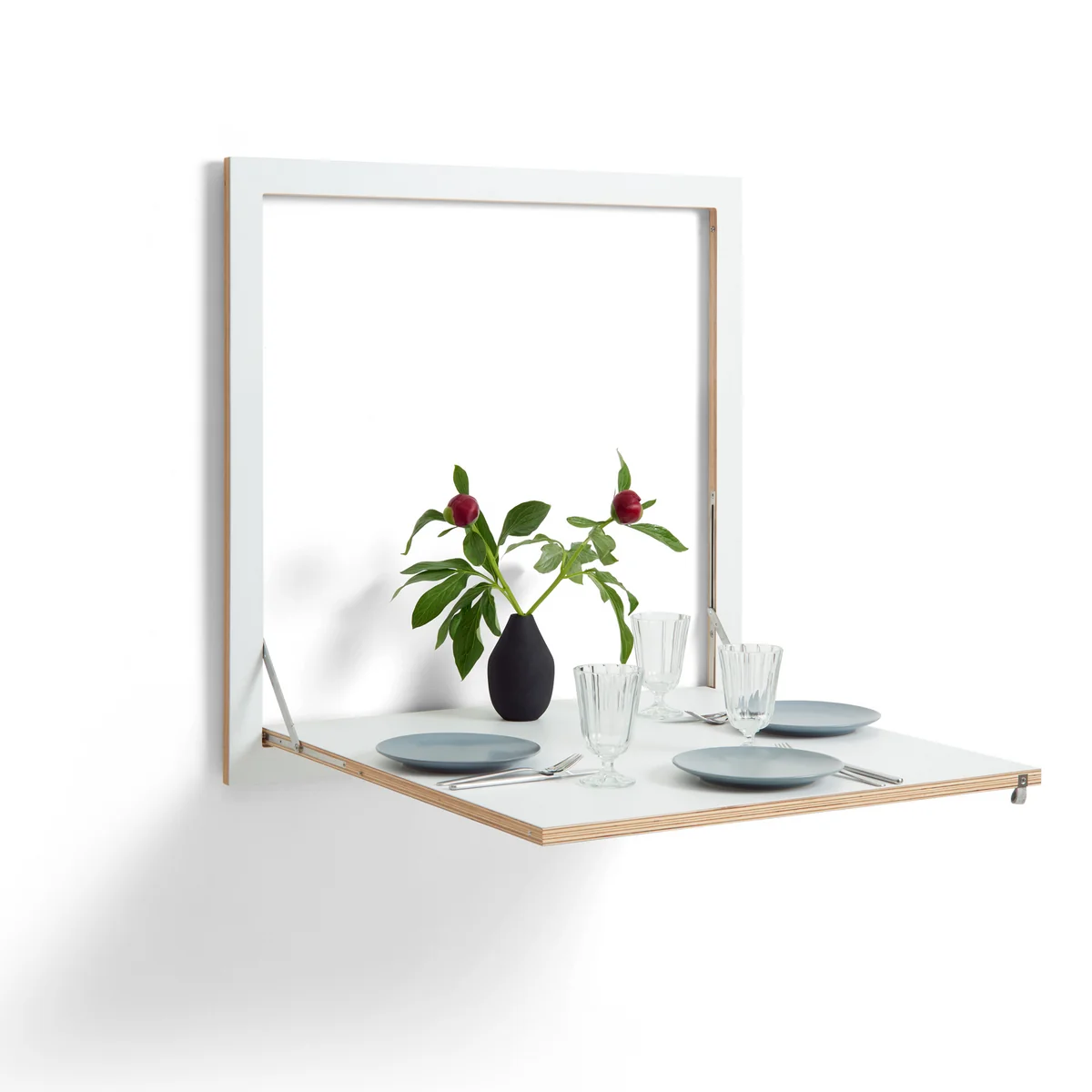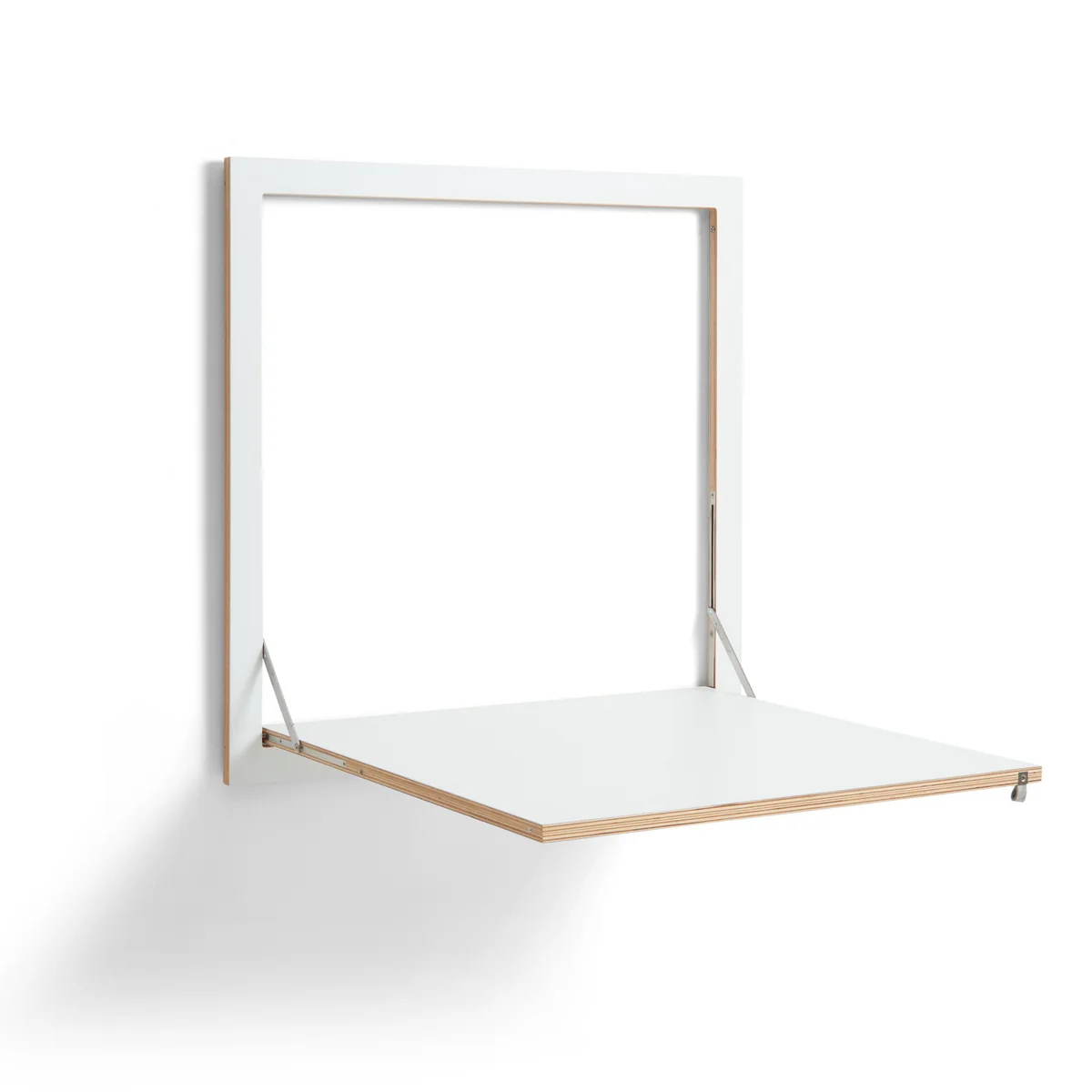 De klaptafel is gemaakt van multiplex berkenhout met roestvrijstalen scharnieren. Handgeschilderd en verkrijgbaar in verschillende kleuren. Een kleine vilten lus vergemakkelijkt het uitklappen van het blad. Opgevouwen heeft de extra platte wandtafel een diepte van slechts 3 cm, waardoor hij absoluut ruimtebesparend is.