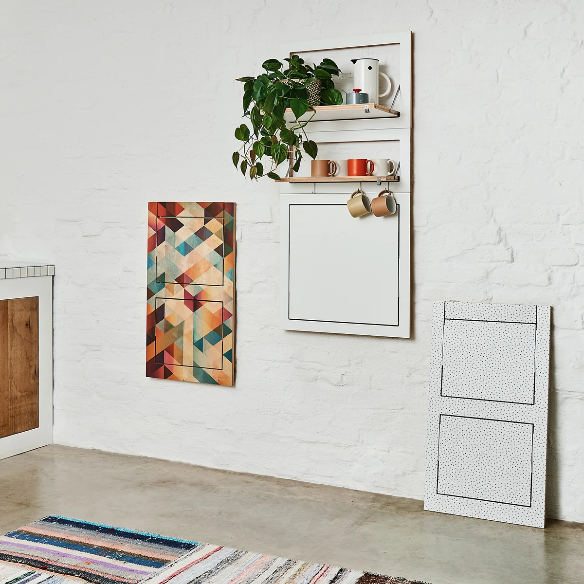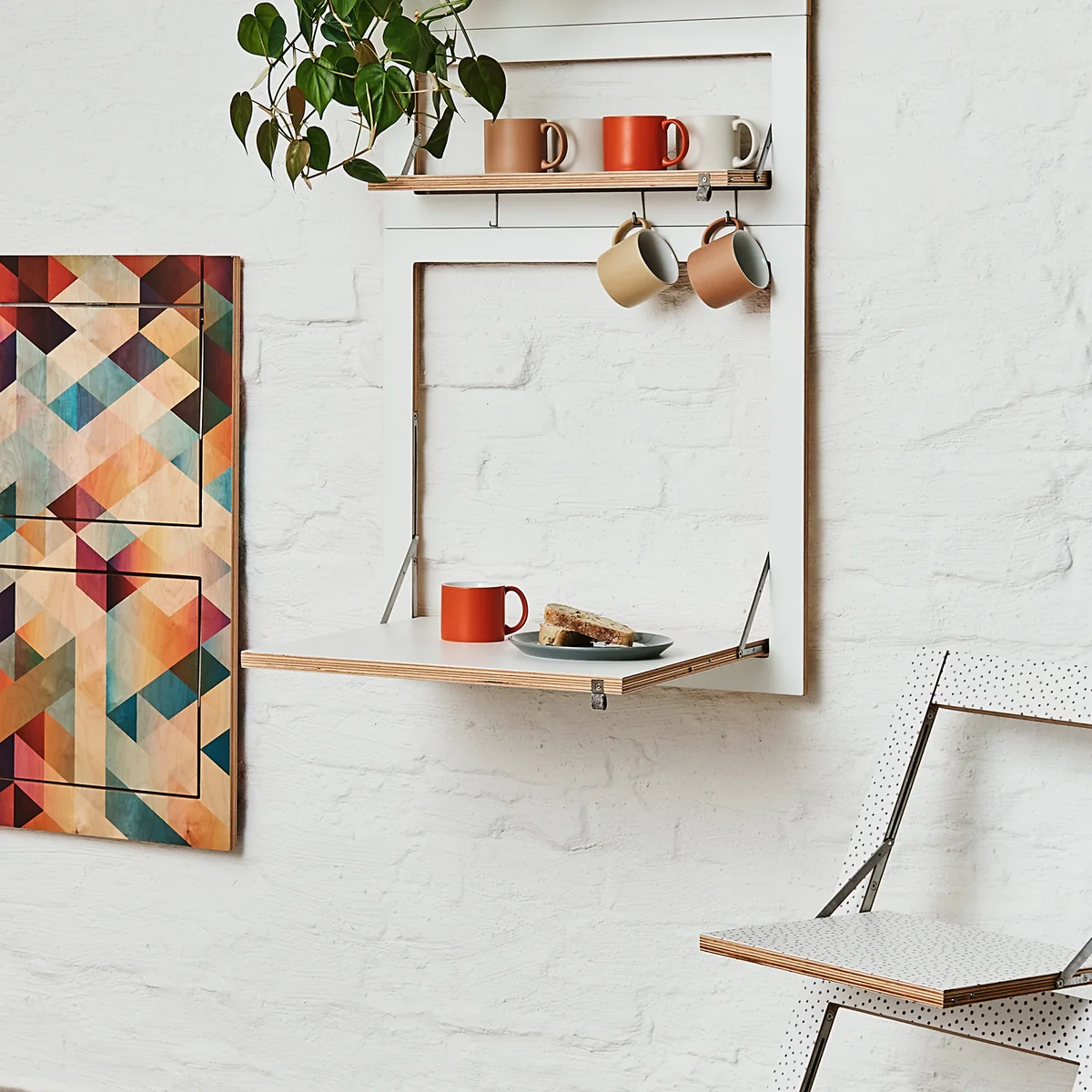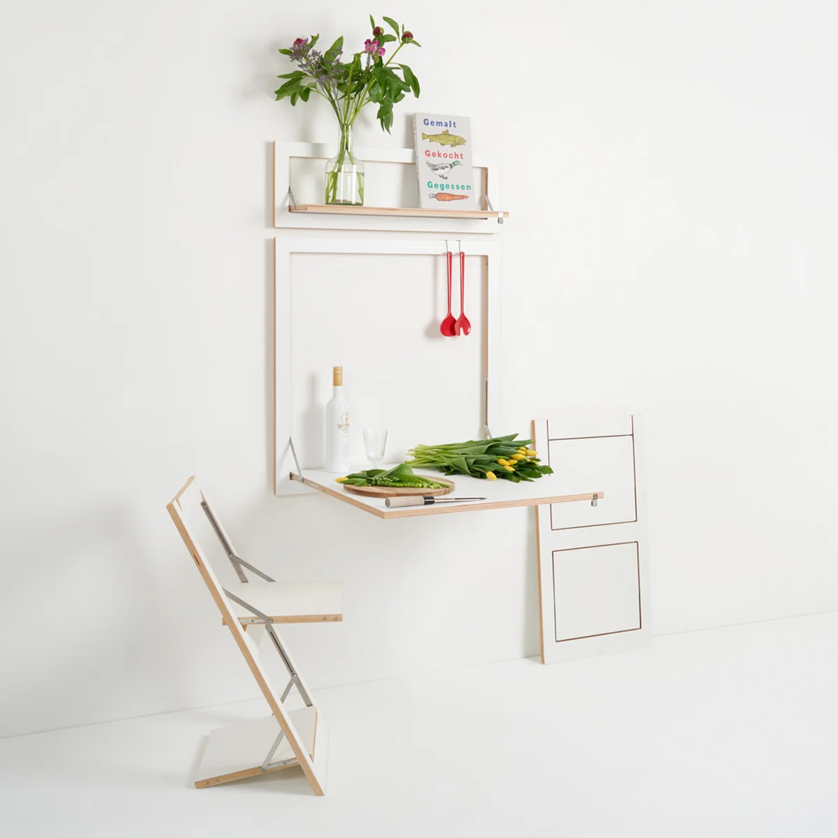 De Fläpps Kittchen tafel van Ambivalenz is de ideale tafel voor kleine keukens en ruimtes waar geen ruimte is voor een normale tafel. De inklapbare wandtafel is geschikt voor een ontbijt voor twee personen, als werkblad voor het hakken en bereiden van fruit, groenten, vlees en co. en ook als flexibel bureau.