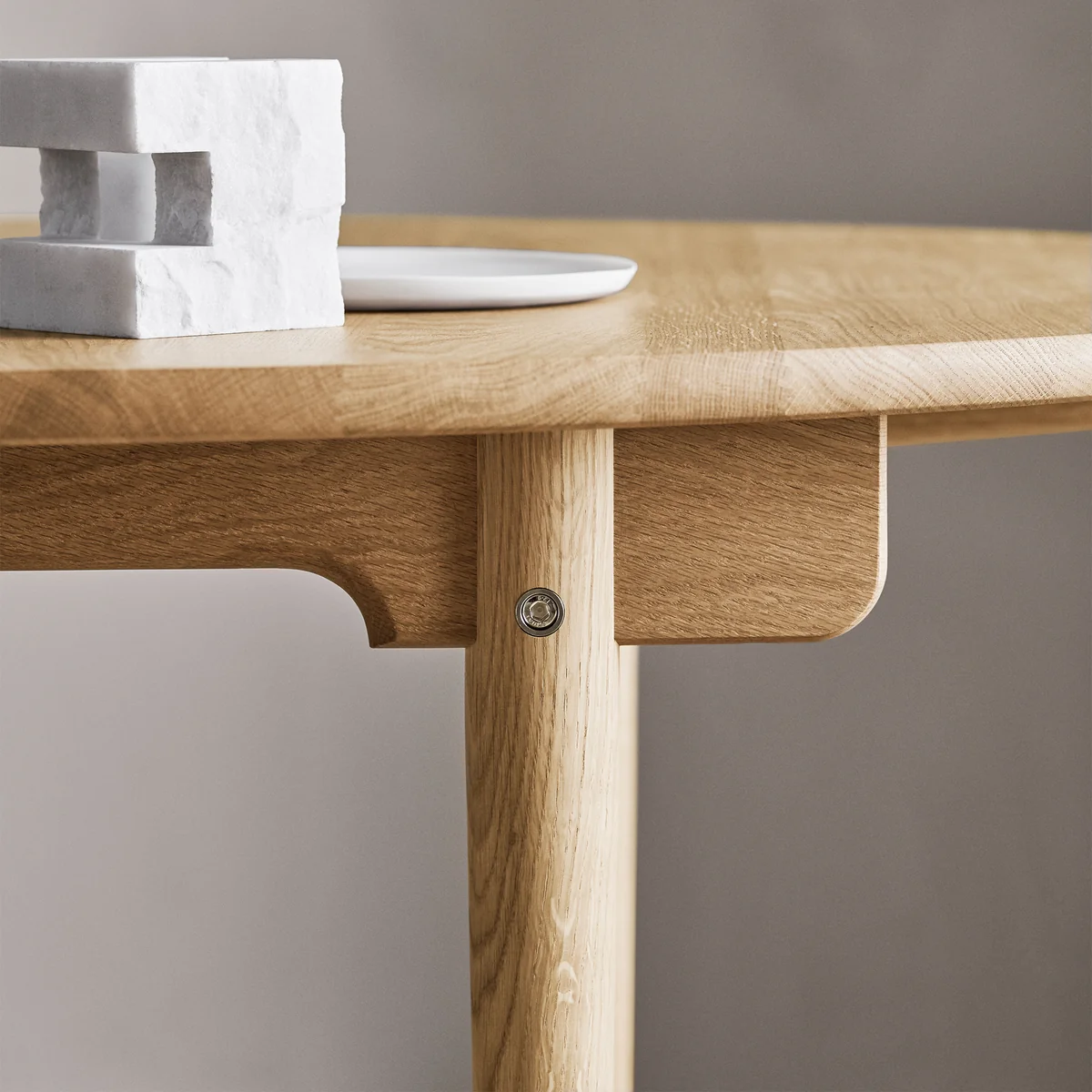 In 1962, ontwierp Hans J. Wegner de eettafel CH338 voor Carl Hansen en creëerde een slim meubelstuk dat in verschillende interieurs past. Met zijn afmetingen van 200 x 115 cm biedt de tafel plaats aan 8-10 personen en is dus ideaal voor dineravonden met vrienden en familie. Als er onaangekondigde gasten moeten worden toegevoegd, is dat ook geen probleem, want de tafel kan gemakkelijk worden uitgebreid met behulp van twee extra verlengbladen (apart verkrijgbaar), zodat er nog eens 4 personen aan het diner kunnen deelnemen.