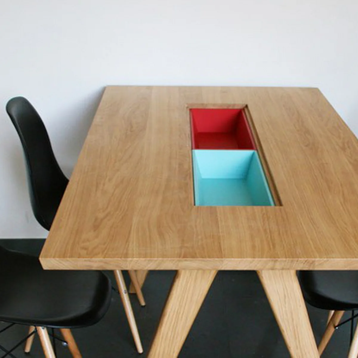 Er zijn twee vakken in het midden van het tafelblad, perfect voor het opbergen of uitstallen van decoraties, tafelaccessoires of andere kleine voorwerpen. De gekleurde vakken kunnen worden afgedekt met twee borden, zodat de inhoud verborgen blijft en de tafel gewoon kan worden gebruikt.