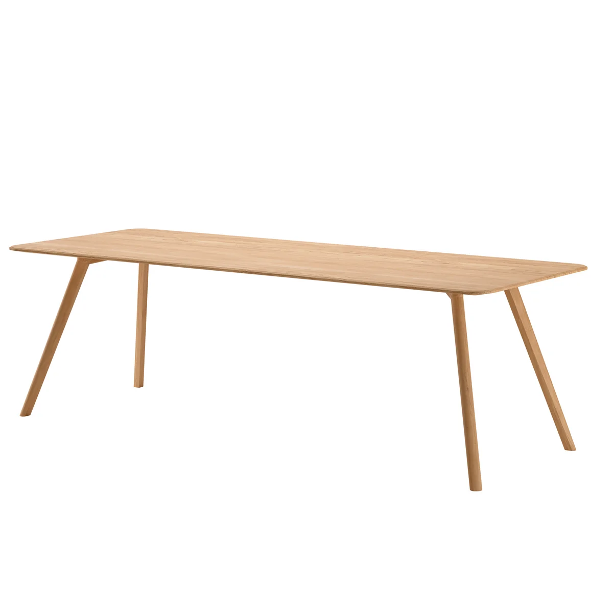 De eettafel is een plaats waar wij elkaar ontmoeten, samen eten en praten, een plaats van samenzijn. De Meyer eettafel door David Spinner voor OUT Objekte unserer Tage is zo'n plek en straalt door zijn materialiteit en vormgeving warmte, gezelligheid en geborgenheid uit. Gemaakt van massief essen- of eikenhout, waarvan de houtnerf duidelijk zichtbaar is, zet de tafel natuurlijke accenten die elke ambiance gezellig en uitnodigend maken. Door het dunne tafelblad en de slanke poten oogt het geheel helemaal niet massief, maar krijgt het een eerder Scandinavisch tintje.