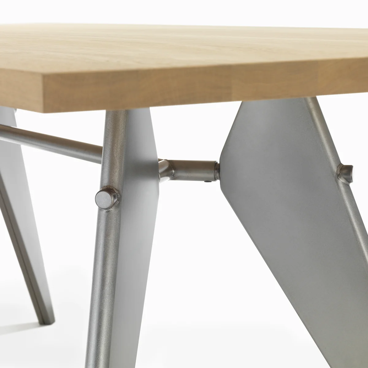De schuin geplaatste, taps toelopende poten geven de EM Table een constructieve dynamiek en kracht. Een dwarsbalk van ronde buis verbindt de poten om stabiliteit te creëren. Het houten tafelblad contrasteert met het metaal en maakt de tafel lichter. De vandaag door Vitra geproduceerde tabel EM Table is emblematisch voor de ontwerpfilosofie van Jean Prouvé, die gedijt op de combinatie van architectuur, technologie en vakmanschap.