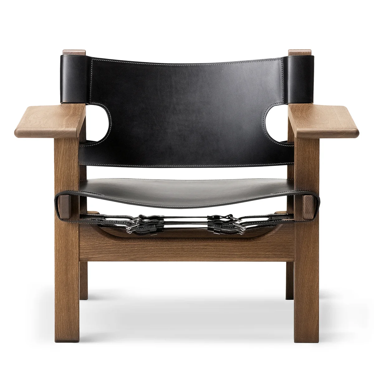 De Spaanse stoel van Fredericia is een fauteuil gemaakt van zadelleder en massief hout door Børge Mogensen die geïnspireerd werd door traditionele Spaanse fauteuils tijdens een reis door Spanje in 1958. De zitting en rugleuning zijn verstelbaar dankzij de massief messing gespen en de stoel is eenvoudig te verplaatsen.