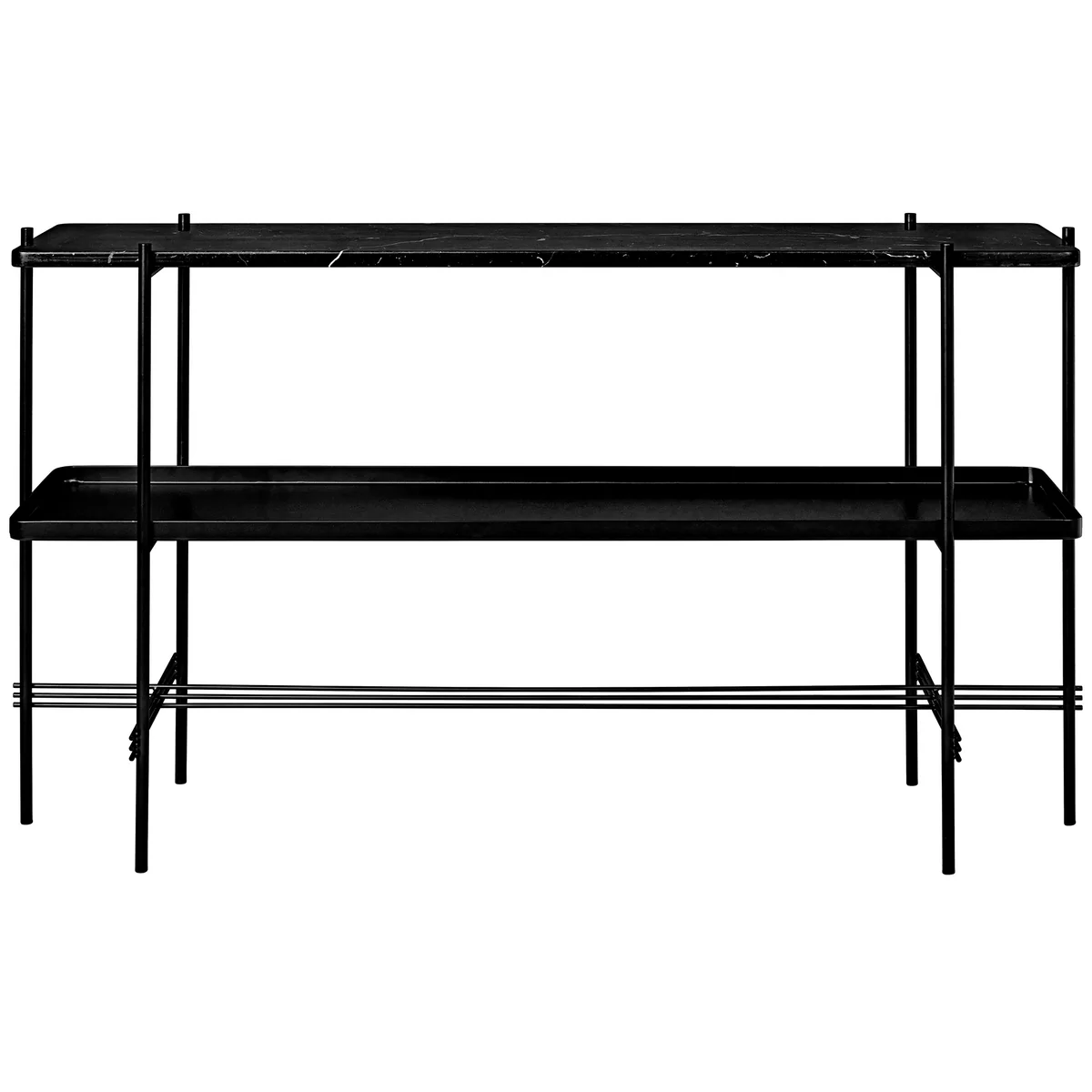 De TS consoletafel van Gubi bestaat uit een marmeren tafelblad en een zwart stalen frame.