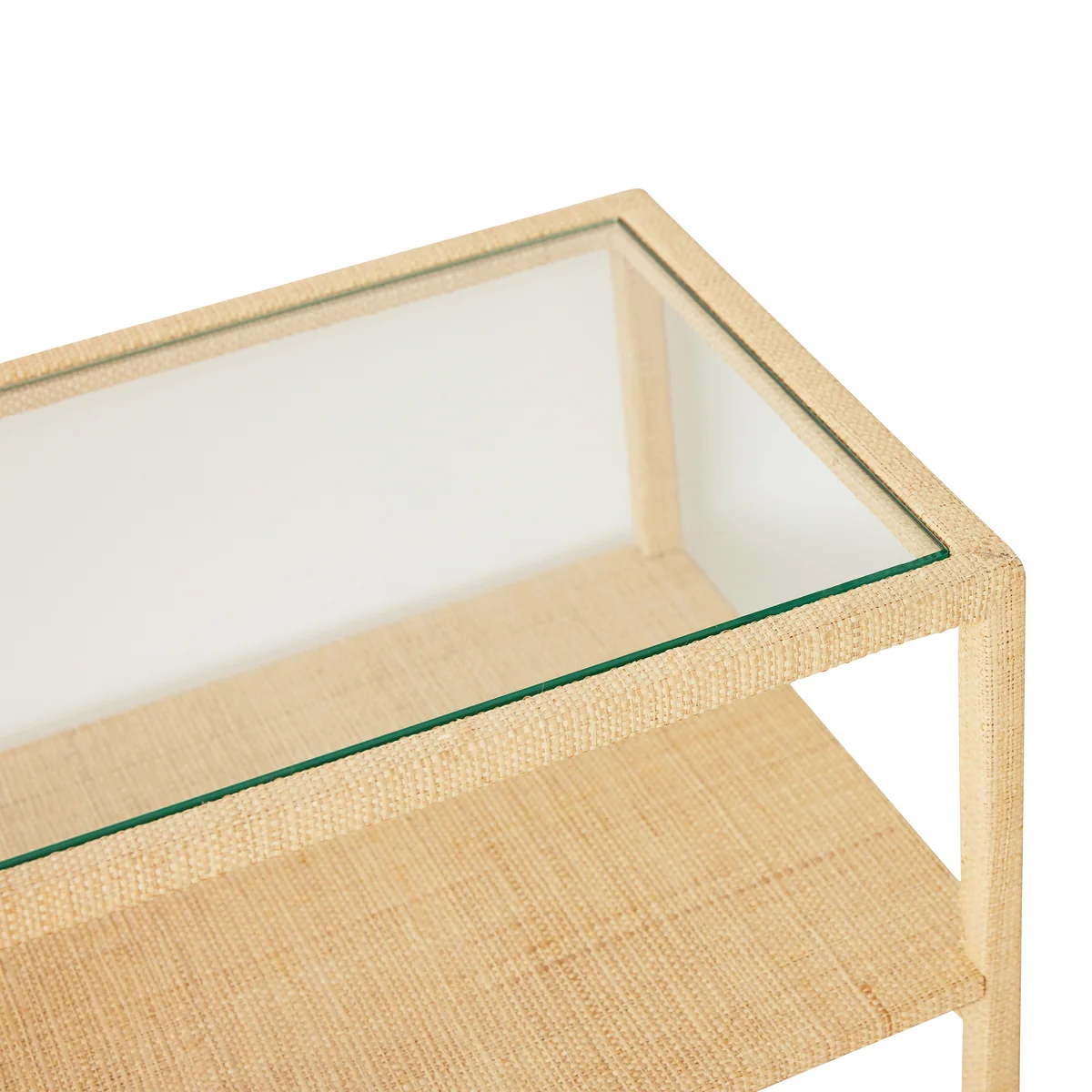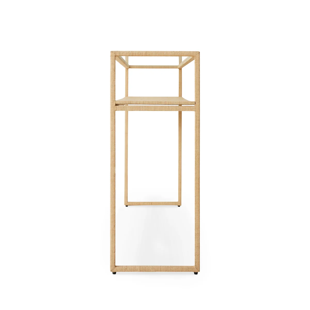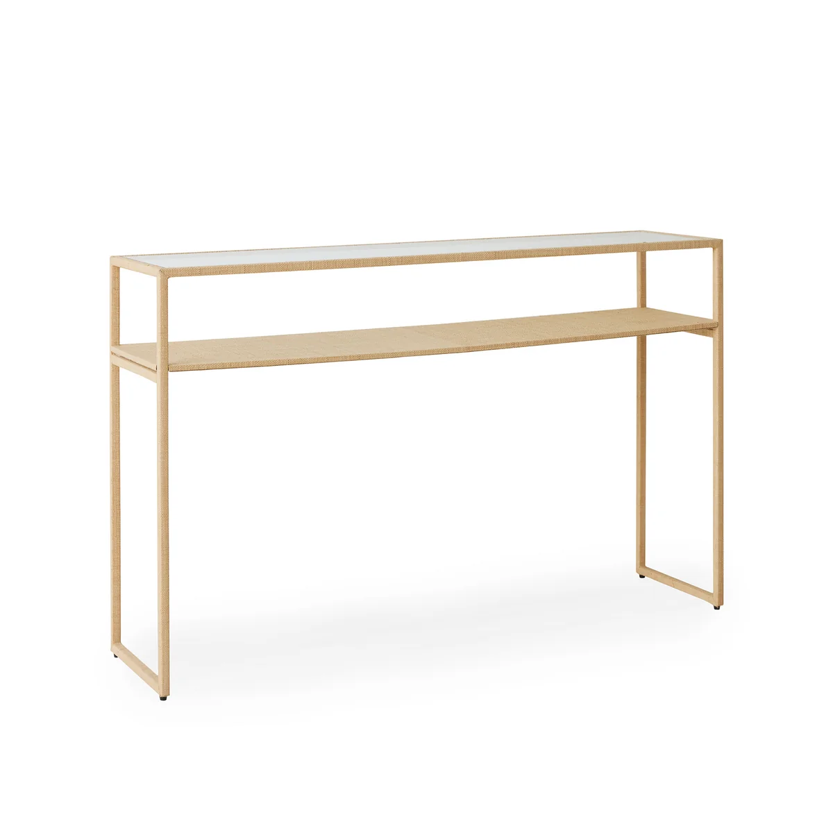 Deze console is meesterlijk vervaardigd en versierd met handgeweven raffia. Het ingewikkelde geweven patroon en de handgemaakte kwaliteit maken het tot een waar kunstwerk. De console heeft een royaal tafelblad en twee laden die genoeg opbergruimte bieden voor persoonlijke spullen. Hierdoor is het niet alleen een decoratief element, maar ook een functionele opberger.