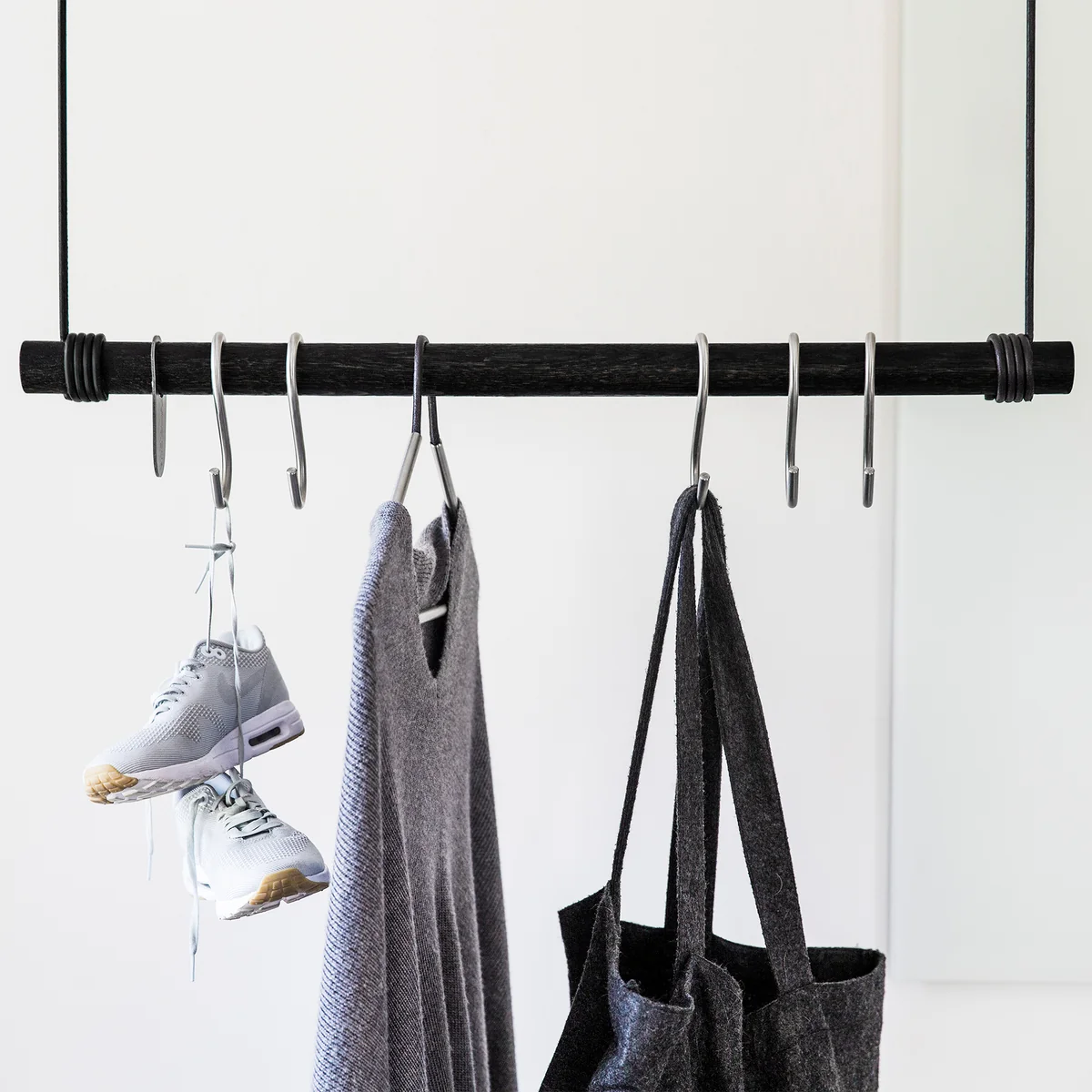 De kledingrailhaak, vervaardigd door Lind DNA, is een s-vormige haak van roestvrij staal. Als ophanghaak aan kledingrails of als aanvulling op kleerhangers of muurhaken - de S met zijn eenvoudige, slanke vorm biedt een handige aanvulling voor garderobes of kapstokken. Kleding, maar ook sieraden of andere accessoires worden op een discrete en slimme manier opgehangen.