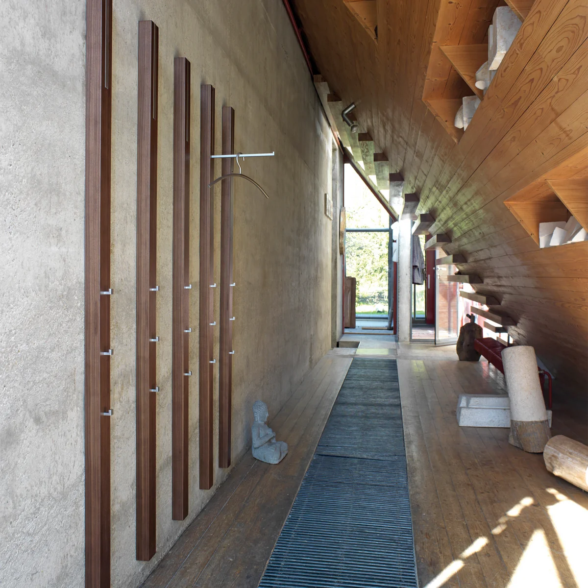 Aan het hoofdeinde heeft Line een opklapbare haak die tot 26,5 centimeter uit de kapstok steekt. Line is hier echter flexibel: de hellingshoek kan aan de achterkant met een stelschroef worden aangepast. Zo kan de kapstok direct jassen vasthouden, maar ook met jashaken worden opgehangen (als de opklapbare haak haak haaks op de kapstok staat) en zo indirect nog meer capaciteit vasthouden. Solo of in een groep naast elkaar - Line bergt uw kleding stijlvol en veilig op.