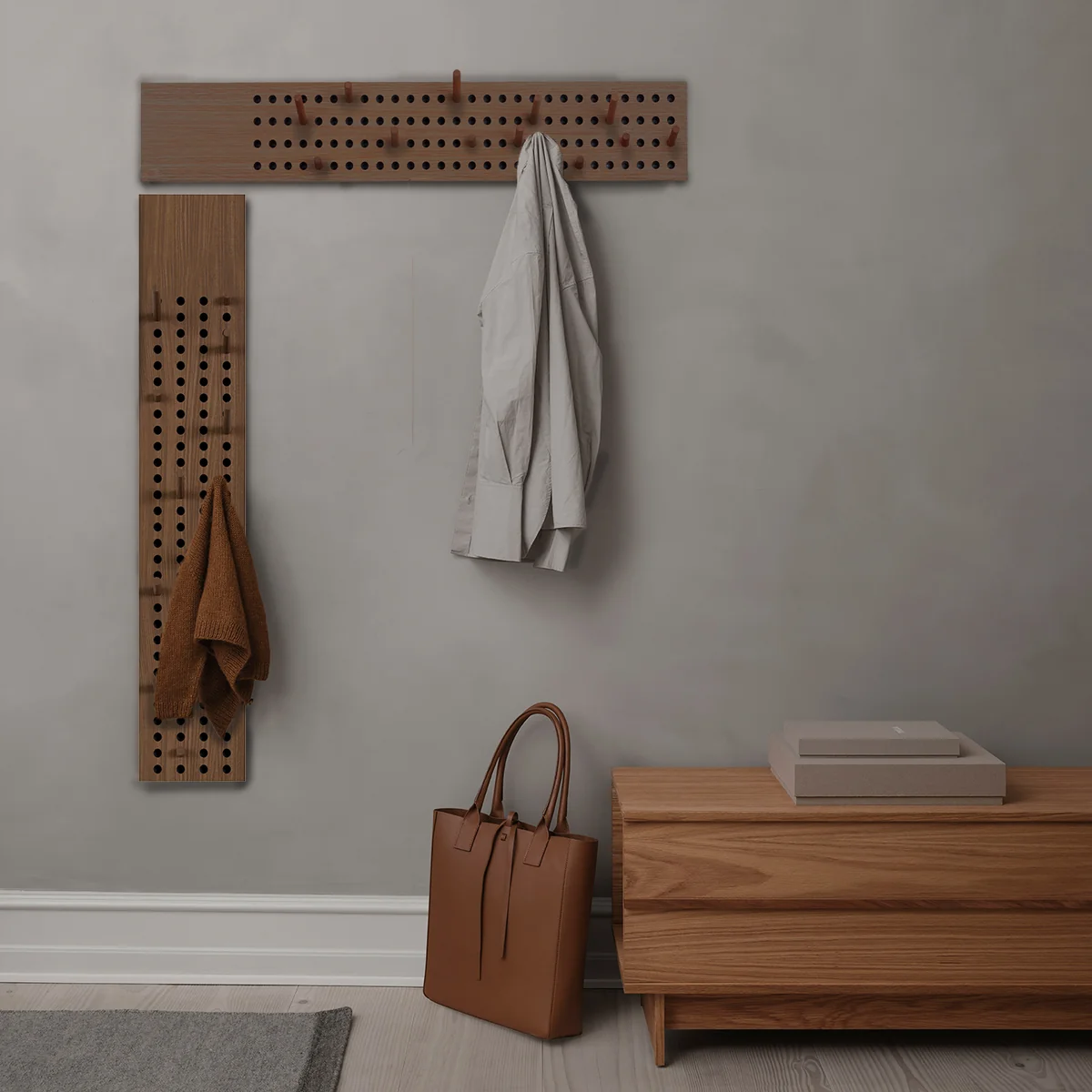 Scoreboard is een grafisch aantrekkelijke kapstok van We Do Wood , die geheel naar eigen wens kan worden ontworpen. De pinnen van verschillende lengte dienen als haken voor jassen, tassen en hoeden en kunnen worden bevestigd door ze gewoon in te steken. Enerzijds maken de spelden het mogelijk om te sorteren volgens familieleden of kledingstukken, anderzijds kunnen de houten staafjes ook worden gebruikt om slimme patroontjes te vormen. Dus geen enkele We Do Wood s garderobe lijkt op de andere!