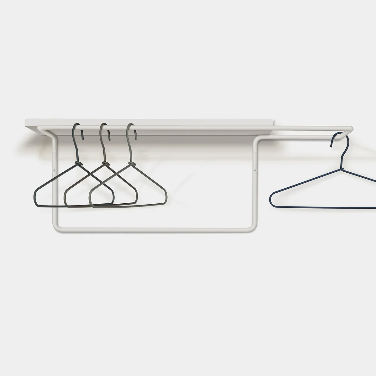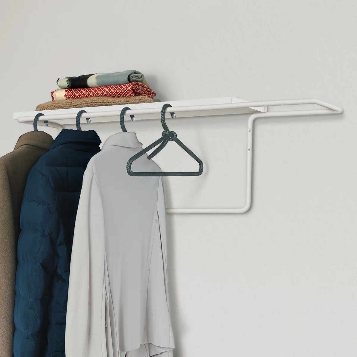 Terwijl jassen en jassen aan de afgeronde kleerhangers kunnen worden opgehangen, biedt een plank van gepoedercoat staal ruimte voor hoeden, tassen of sjaals. De draadgarderobe van Martin Hirth kan ook worden gebruikt als alternatieve kledingstang in de slaapkamer, waardoor de kleding op een slimme manier ruimtebesparend kan worden opgeborgen.