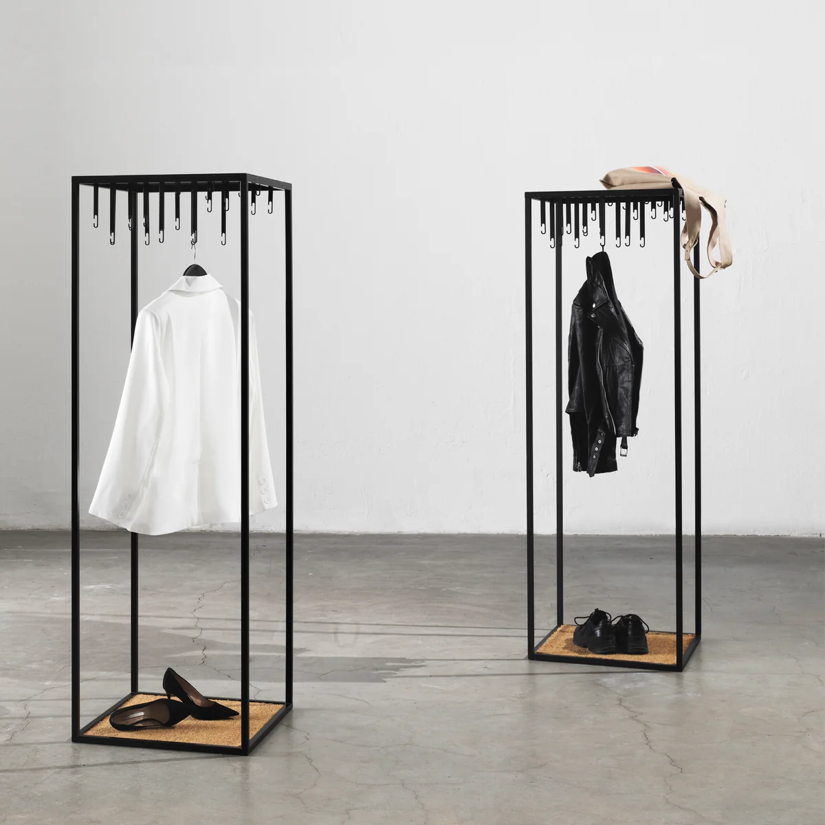 De 170 cm hoge garderobe is ook te vinden in sommige modewinkels, waar het de nieuwste modestukken op een speciale manier presenteert. Design House Stockholm De Atelier kapstok van is ook ideaal voor gebruik in kantoren, hotellobby's of restaurants. De vloer is bedekt met een natuurlijke kokosmat waarop bijvoorbeeld schoenen geplaatst kunnen worden. Het frame van de Atelier kapstok is gemaakt van gepoedercoat ijzer.