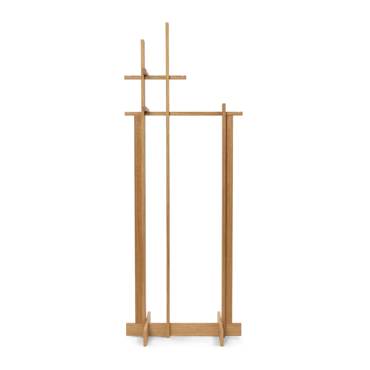 De Bridge garderobe van Ferm Living belichaamt Scandinavische elegantie en functionaliteit in perfectie. Met zijn minimalistische ontwerp en strakke lijnen past hij naadloos in elke kamer en creëert hij een georganiseerde en stijlvolle opbergoplossing voor je kleding en accessoires. Gemaakt van hoogwaardig eikenhout en met doordachte details zoals de draaibare haken, de Bridge maximale flexibiliteit en ruimte voor je jassen en tassen. Een tijdloos stuk dat niet alleen je garderobe organiseert, maar ook een statement maakt op het gebied van design.
