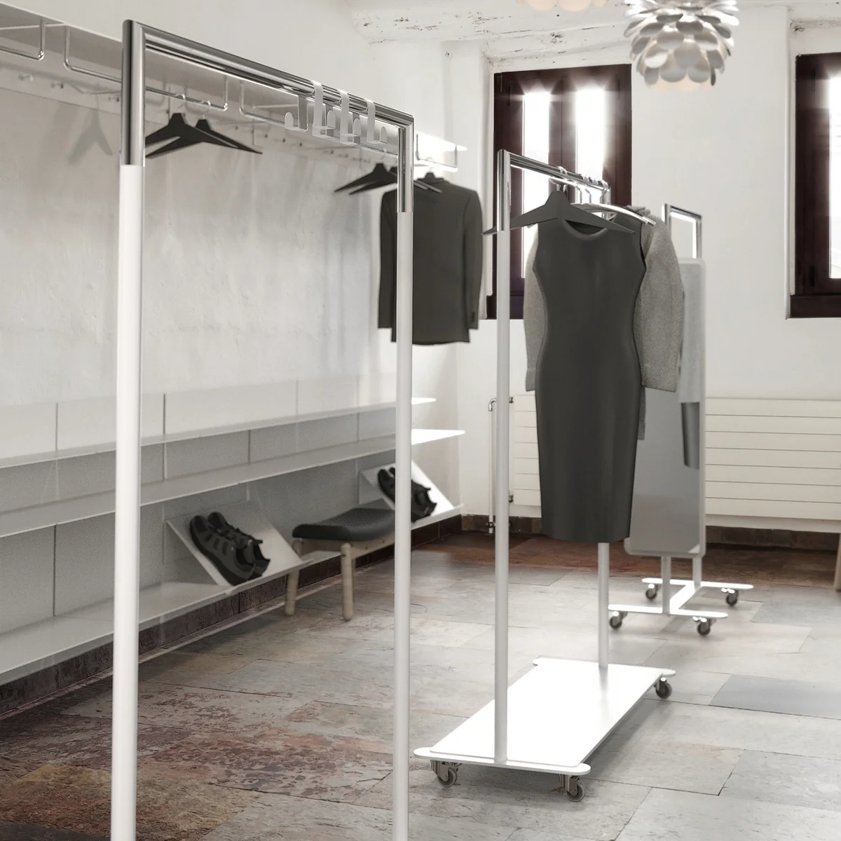 Met de Bukto kapstok van Frost kunt u uw favoriete kleding in stijl inrichten. De door Bønnelycke ontworpen kledingstang heeft een elegant design met rechte lijnen en gedefinieerde randen, maar is zo minimalistisch dat het de show niet van de kleding steelt. Blouses, broeken en truien vinden hier hun plaats in de slaapkamer en zijn direct zichtbaar aan de bar. In de gang daarentegen dient de kapstok als garderobe waar jassen en jassen kunnen worden opgehangen. Dankzij de praktische wielen is de kledingstang verrijdbaar en kan gemakkelijk naar de gewenste plaats van gebruik worden geschoven.