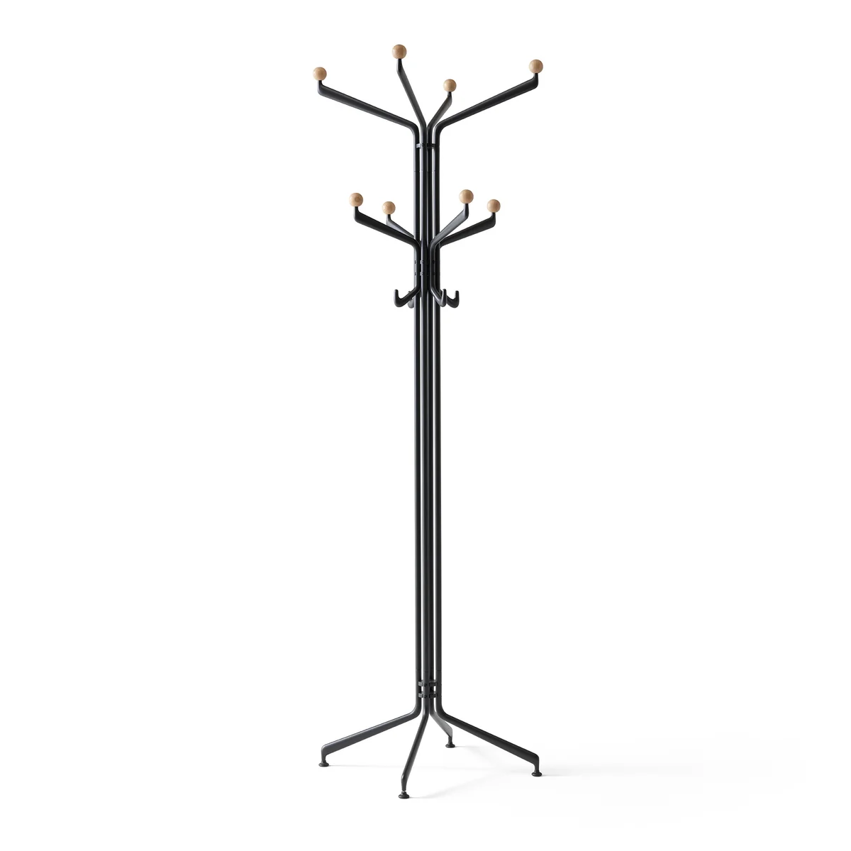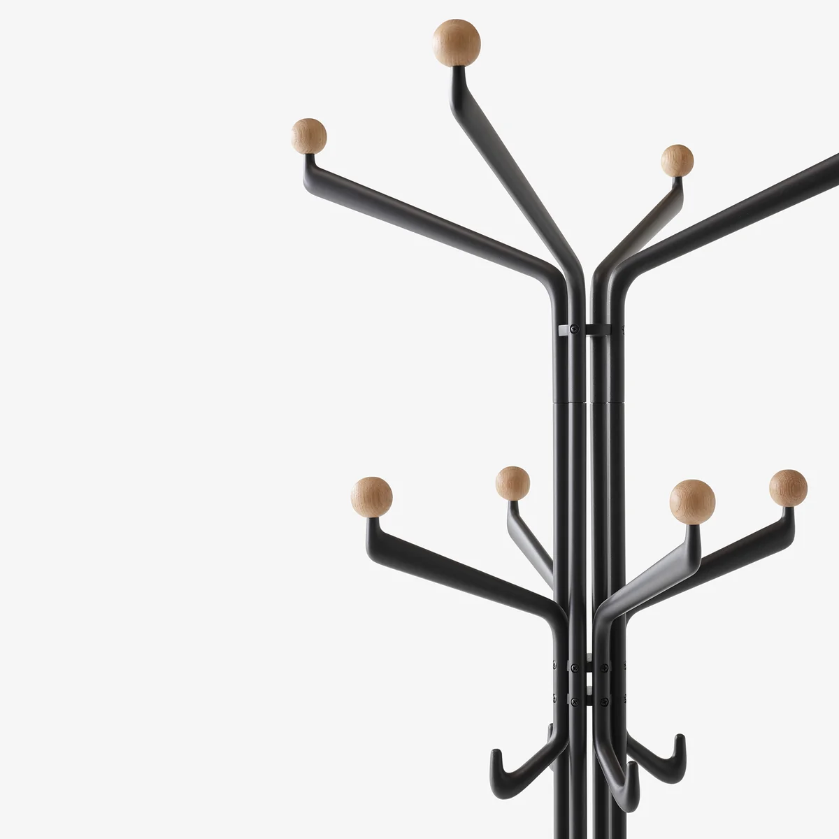 De metalen onderdelen van de kapstok zijn gegoten uit aluminium, vervolgens gefreesd en vervolgens van een poedercoating voorzien. De houten knoppen zijn gedraaid van massief hout.