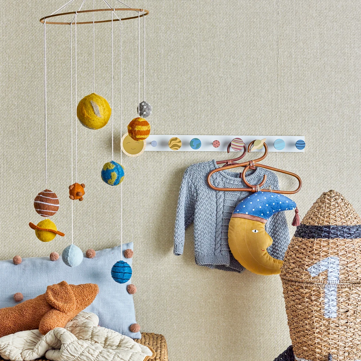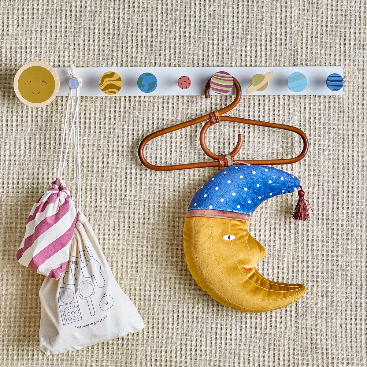 Het Space kapstok van Bloomingville Mini is een uniek cadeau voor nieuwsgierige kinderen en een decoratief hoogtepunt voor elke kinderkamer. Deze kapstok van FSC-gecertificeerd MDF-hout toont ons fascinerende zonnestelsel en heeft haken met de namen van de planeten erboven. Zo leren kinderen spelenderwijs meer over de planeten en hebben ze tegelijkertijd een praktische plek om hun jassen en tassen op te hangen. Het Space hakenrek combineert spelenderwijs leren, functie en esthetiek op een prachtige manier en helpt de verbeelding en dorst naar kennis van kleine ontdekkingsreizigers te stimuleren.