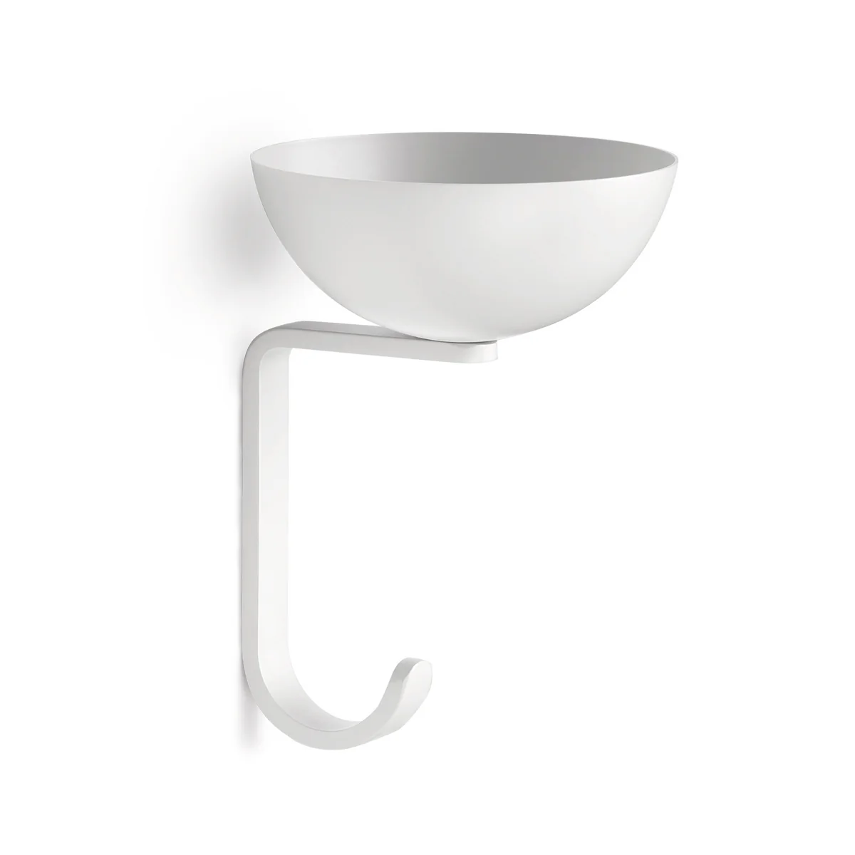 De wandhaak van staal en aluminium is gecombineerd met een kleine ronde kom - lijkend op een vogel - die nest - die allerlei voorwerpen veilig opslaat.