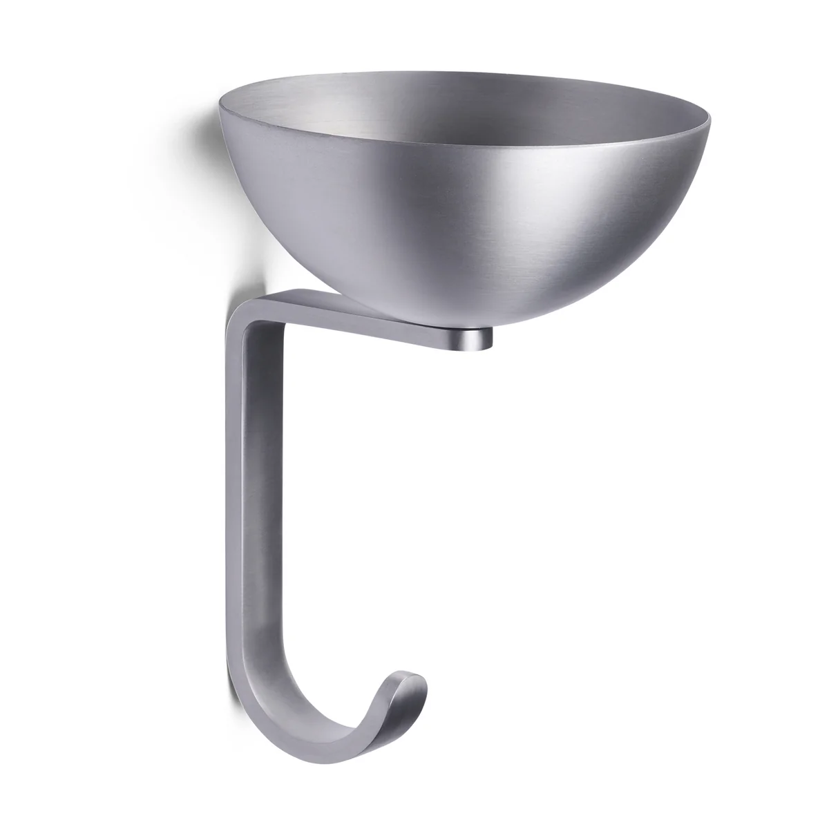 De wandhaak van staal en aluminium is gecombineerd met een kleine ronde kom - lijkend op een vogel - die nest - die allerlei voorwerpen veilig opslaat.