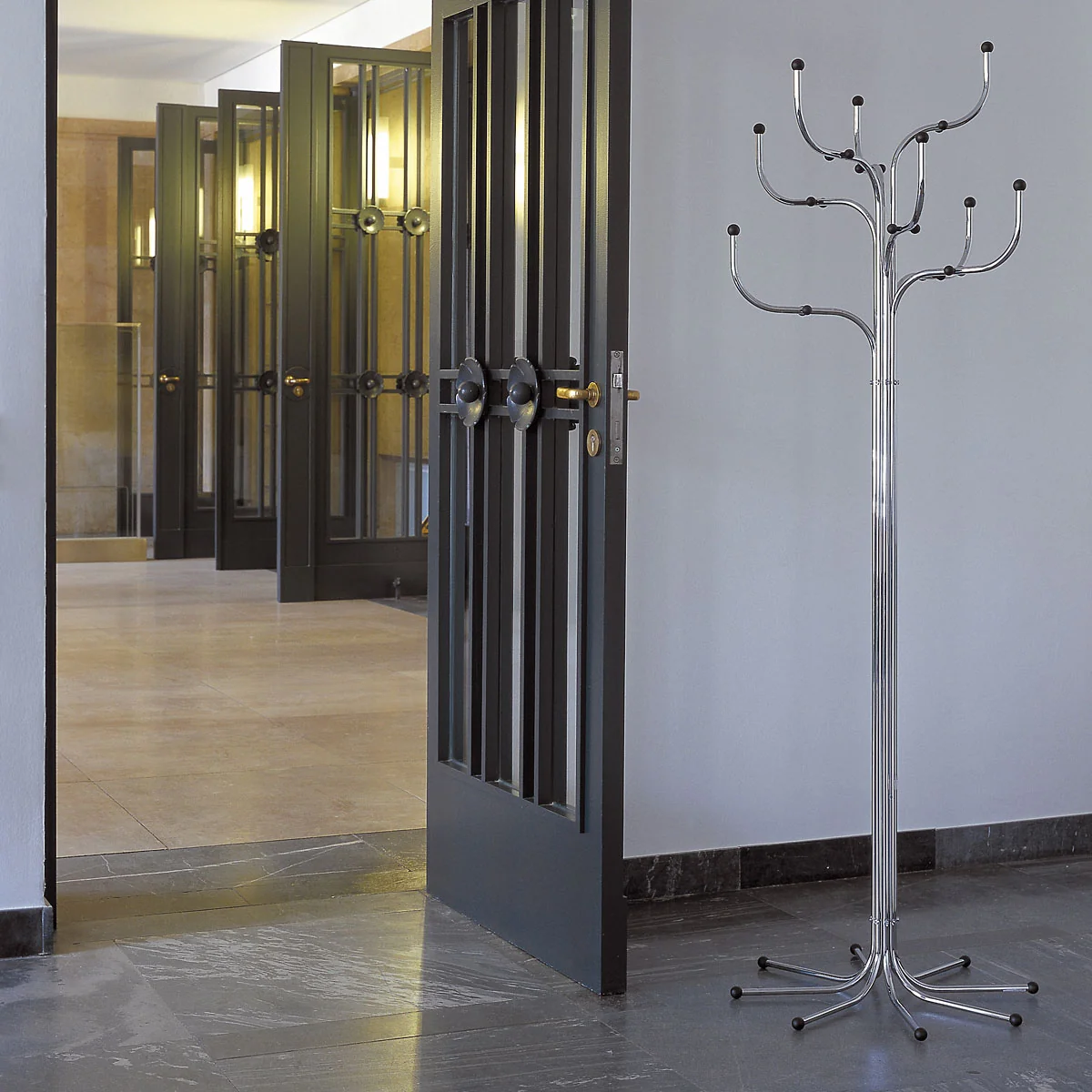 Coat Tree is verkrijgbaar in verchroomd staal met zwarte kunststof bolletjes en in drie gelakte edities: veelkleurig, grijstinten of wit met geschikte kunststof bolletjes.
