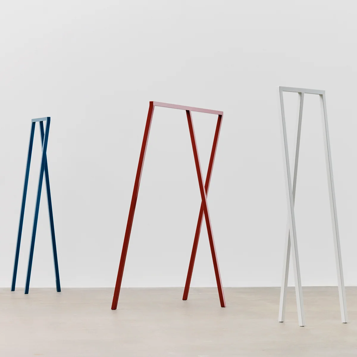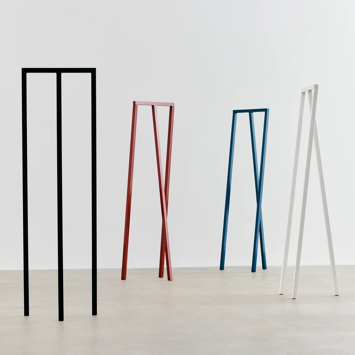 De kapstok met drie poten is een vereenvoudiging van de industriële zaagbok. Hij is gemaakt van gepoedercoat staal en verkrijgbaar in twee verschillende maten. De kleinere heet Loop Hall, de grotere Wardrobe. Jassen, overhemden en andere kleding kunnen eenvoudig worden opgeborgen op de dwarsbalk, die wordt ondersteund door de drie poten, met behulp van een kledinghanger.