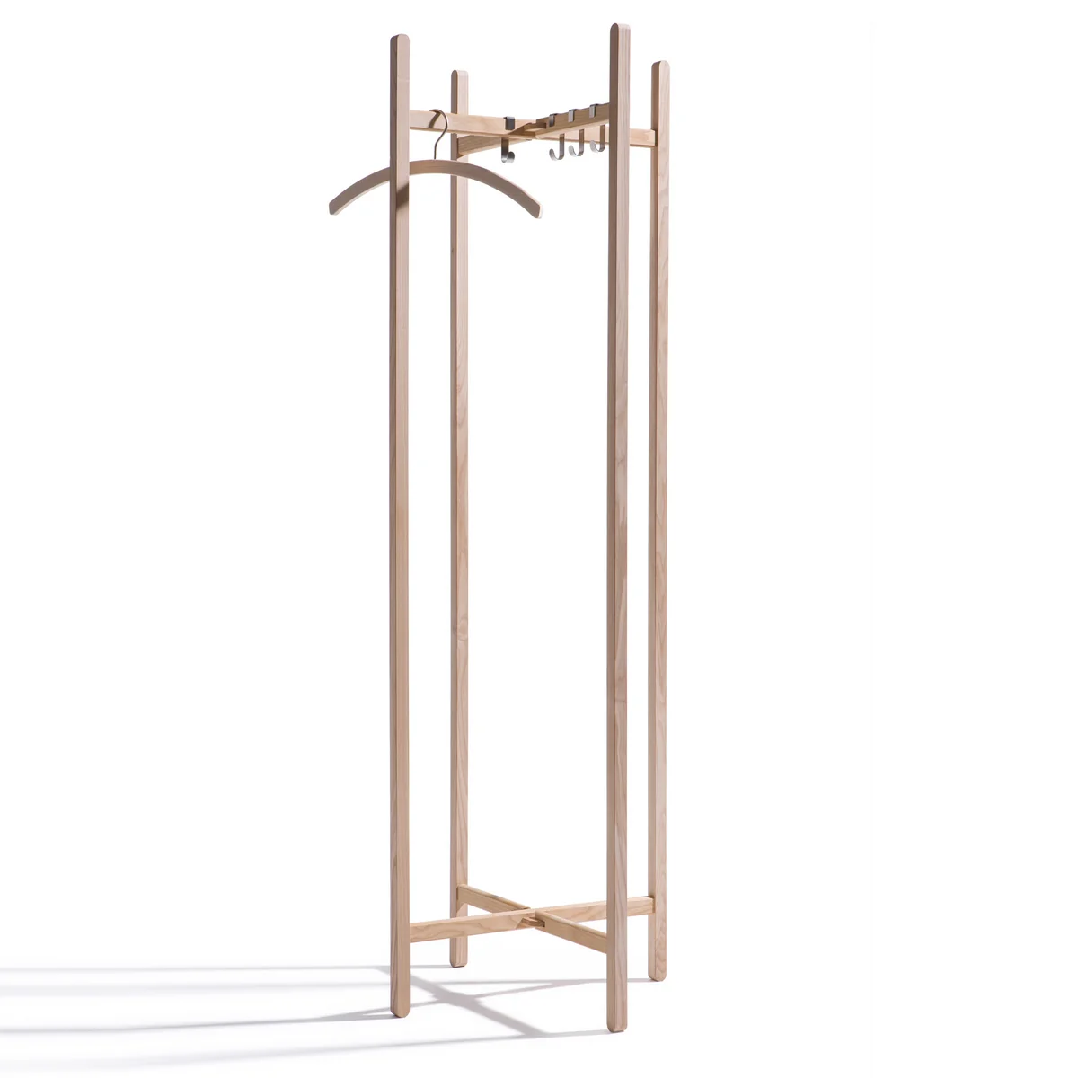 En dit alles zonder effectvereiste ontwerpen: De New Hang On blijft aangenaam op de achtergrond. Hangers kunnen gemakkelijk aan de rails worden gehangen. Bovendien is er naast elkaar een set haken voor de garderobe, zodat elk op te hangen stuk een geschikte plaats krijgt op het massieve essenhout dat New Hang on.