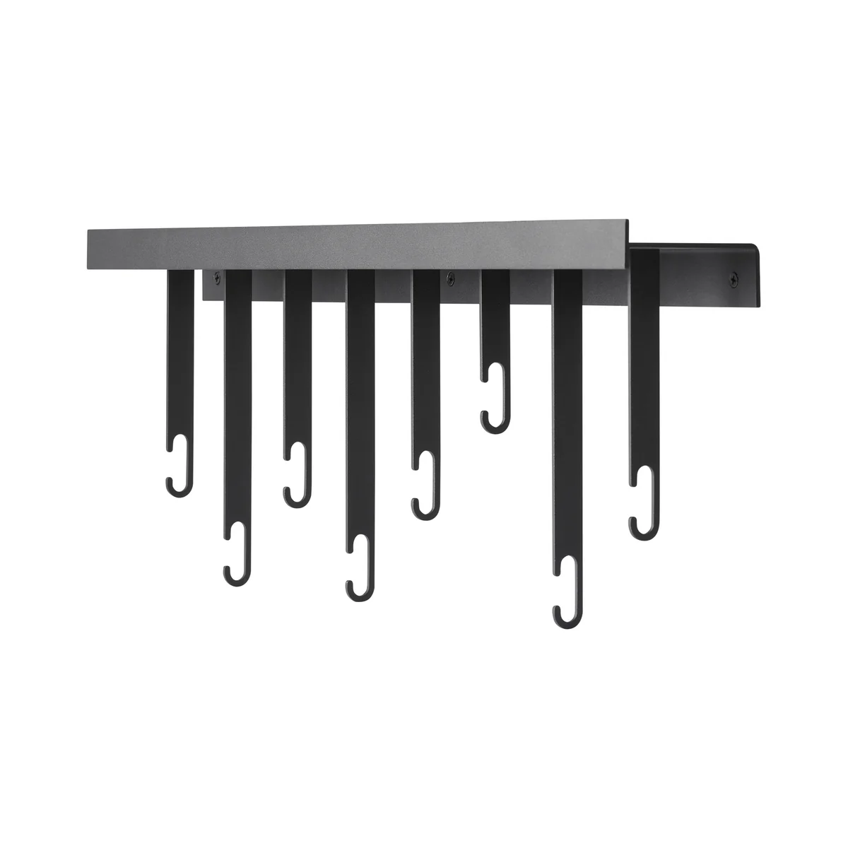 Design House Stockholm De Atelier wandkapstok van is een grafisch vormgegeven wandelement van gepoedercoat ijzer. Jassen, mantels, sjaals en tassen kunnen binnen handbereik worden opgehangen aan de acht haken. De smalle wandbevestiging heeft ook een plank aan de bovenkant voor sleutels, mobiele telefoon en portemonnee.