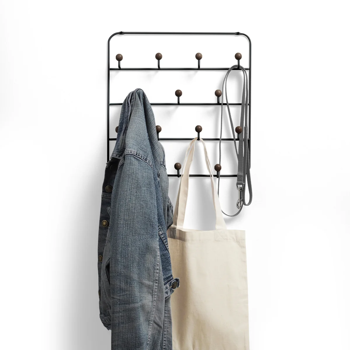 De garderobe bestaat uit een stalen frame en houten kogelhaken. Op 14 haken is er voldoende ruimte voor sieraden, sjaals, jassen, tassen en nog veel meer.