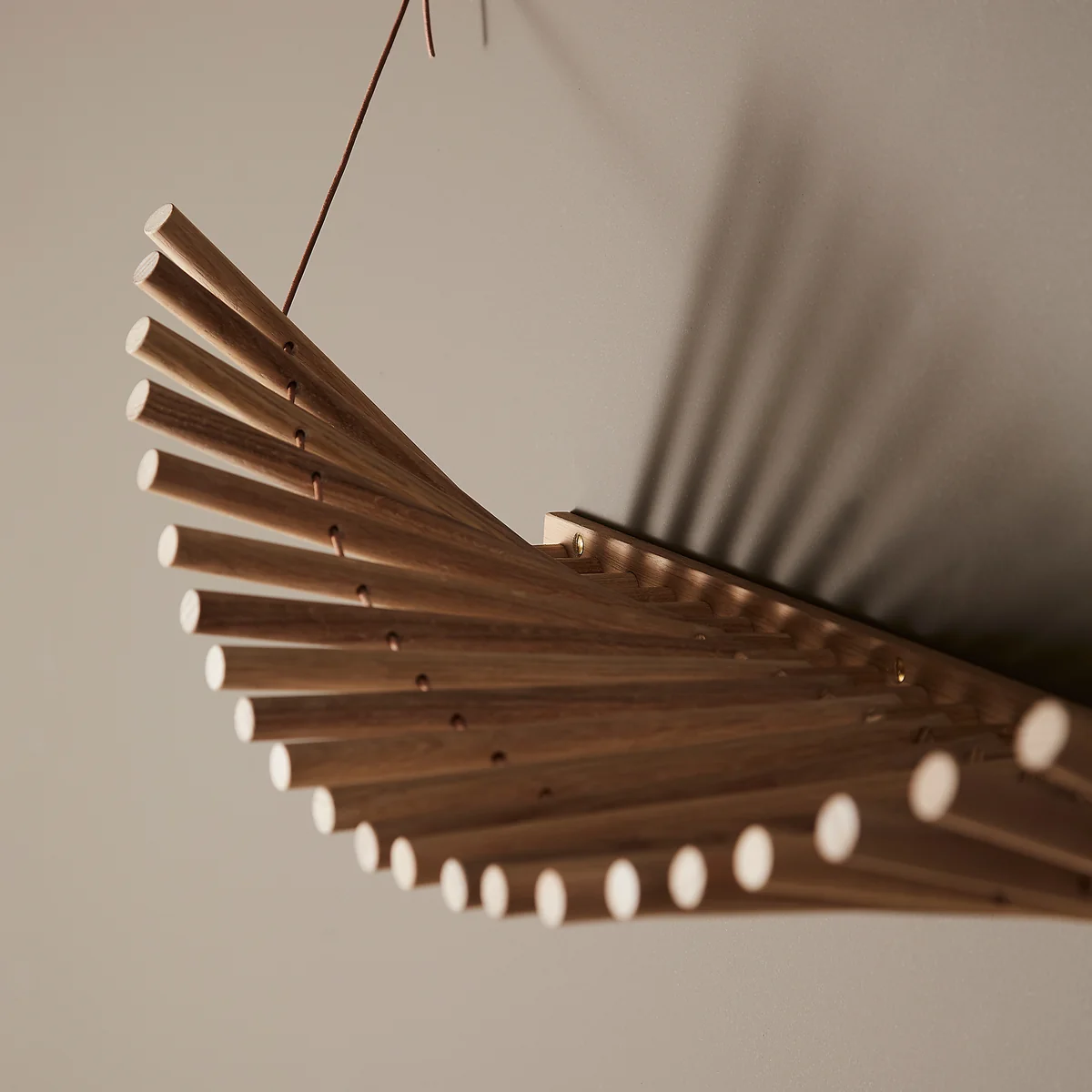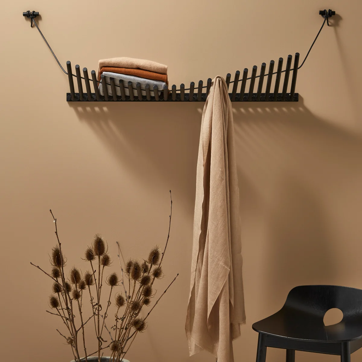 De Knaegt wandkast Woud overtuigt door zijn elegante esthetiek. De eenvoudige herhaling van houten stokjes met een doorlopend lederen koord maakt de garderobe dynamisch, omdat de lijn die door de stokjes wordt gecreëerd verandert afhankelijk van wat er op de plank hangt. Dit geeft de garderobe een modern, levendig karakter.
