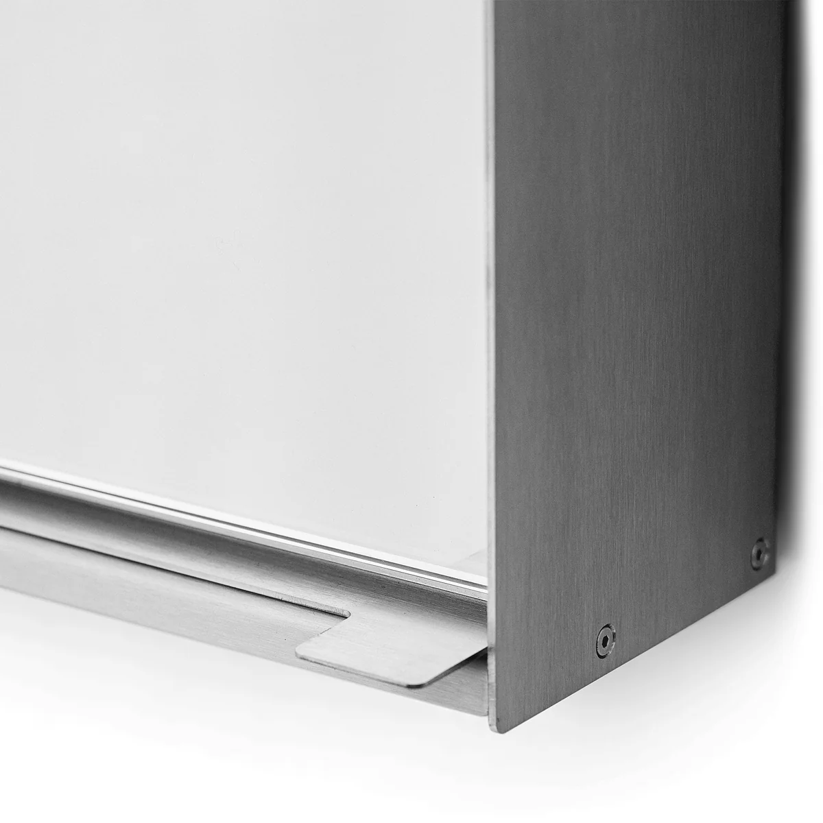 Schuine beugels aan de achterkant zorgen voor stabiliteit terwijl de open, lichte uitstraling behouden blijft. De zacht afgeronde randen benadrukken het hoogwaardige vakmanschap en geven de ruwstalen profielen een aangenaam glad, tactiel oppervlak. Achter de spiegel bevindt zich een verborgen, smalle opbergruimte waarin belangrijke gebruiksvoorwerpen netjes en binnen handbereik kunnen worden opgeborgen - voor een opgeruimde, minimalistische sfeer.