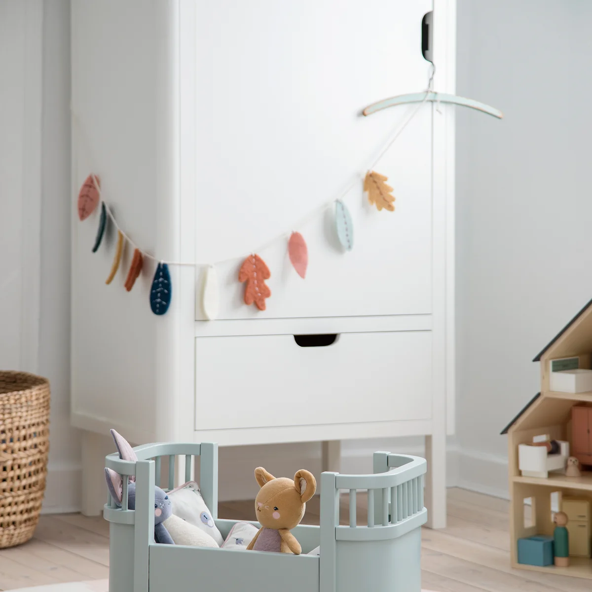Extra voorzieningen zoals ladededempers, afgeronde hoeken en in hoogte verstelbare stangen en planken zonder schroeven maken van deze garderobe van Sebra het perfecte meubelstuk voor elke kinderkamer.