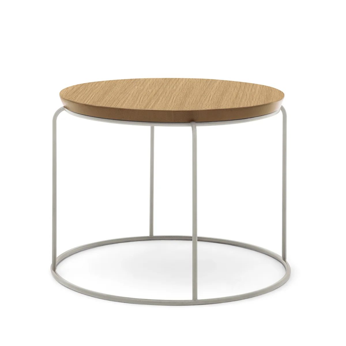 Het tafelblad is ook verkrijgbaar in verschillende versies van eikenhout en het gebogen, gelaste stalen frame is gepoedercoat en verkrijgbaar in verschillende RAL-kleuren. Verschillende hoogtes en een rechthoekig tafelblad worden ook aangeboden als onderdeel van de 151-serie.