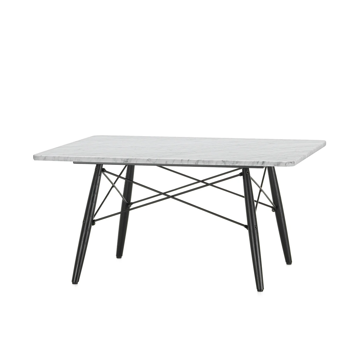 De rechthoekige tafelbladen zijn gemaakt van palisander fineer, marmer of massief Amerikaans notenhout. Het onderstel, dat zwarte houten poten combineert met metalen dwarsbalken, zorgt voor een stabiele onderconstructie en benadrukt de ingetogen elegantie van de Eames salontafel.