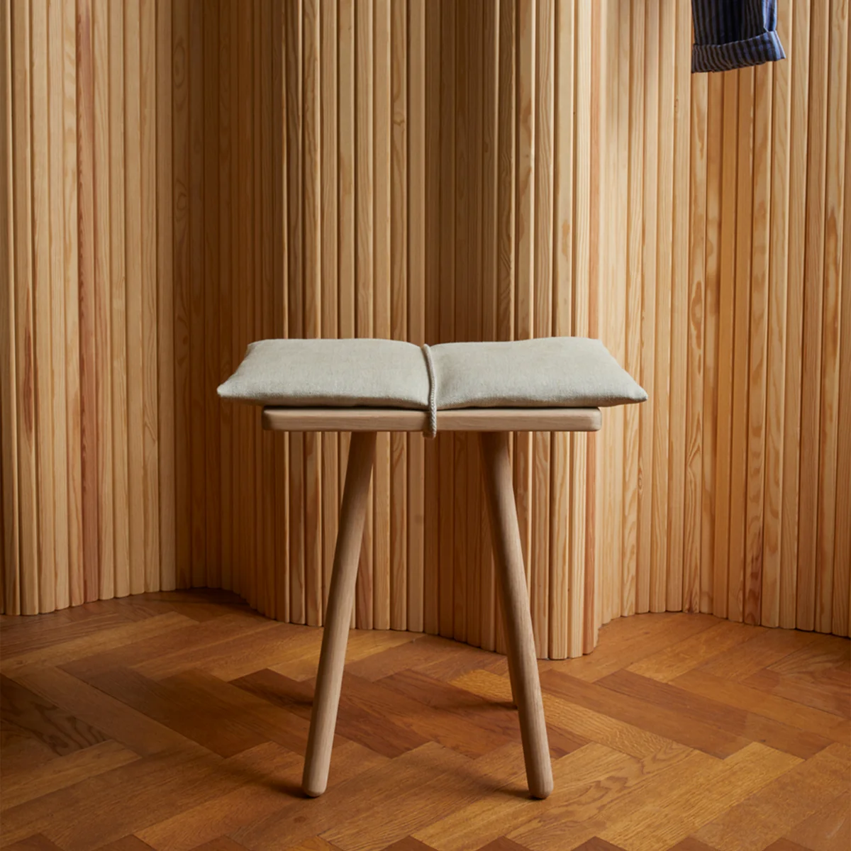 De Skagerak Georg kruk trekt de aandacht met atypische pootposities en wollen kussens die discreet worden vastgehouden door leren koorden. De mix van de Skagerak Georg kruk van eikenhout, ruw leer en gevlekte wol creëert een sterke, natuurlijk-lichte look. Door de heldere vormgeving van de Georg kruk kan de serie van Skagerak elke ruimte veroveren.
