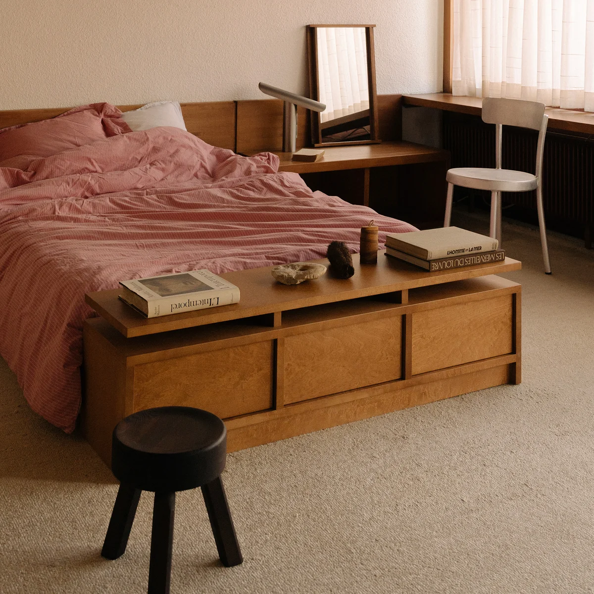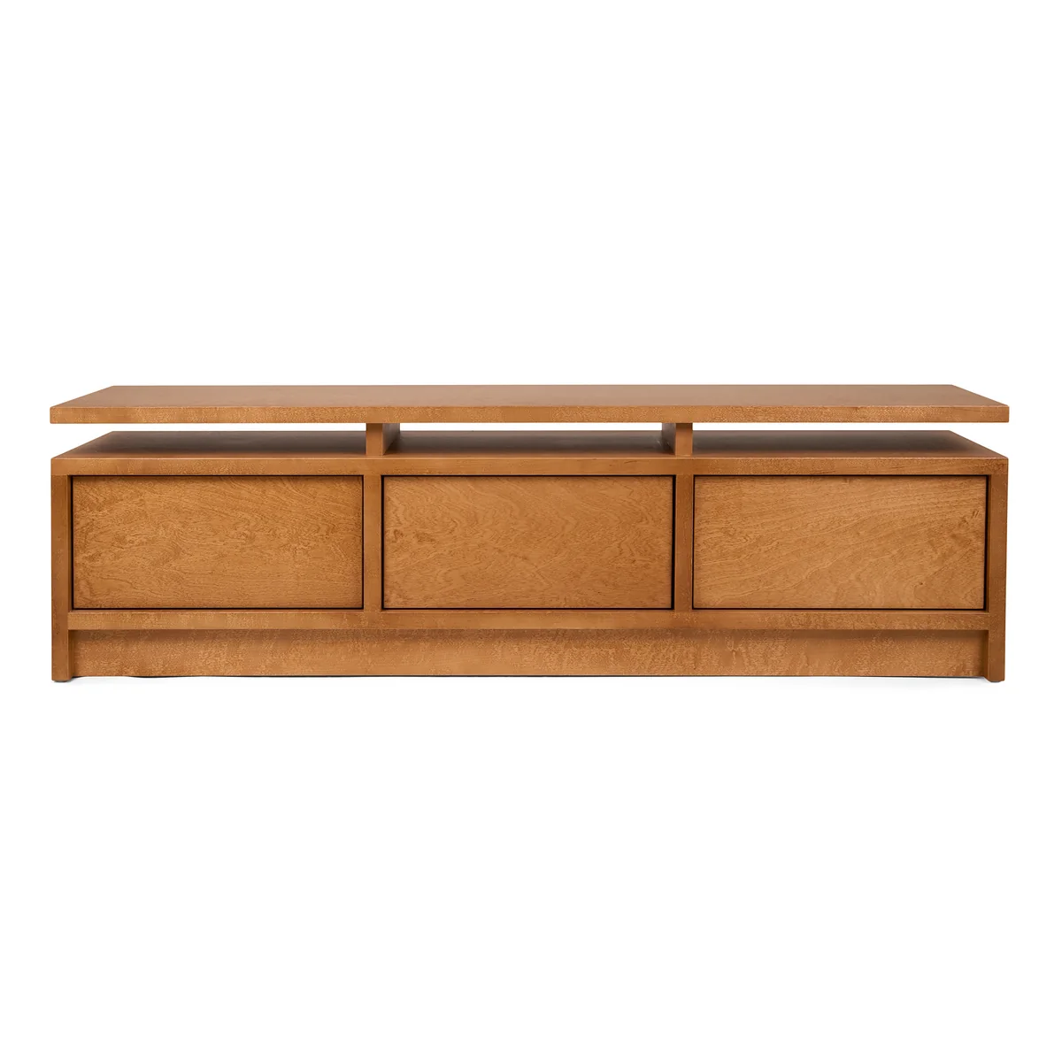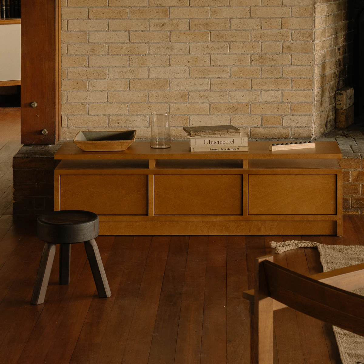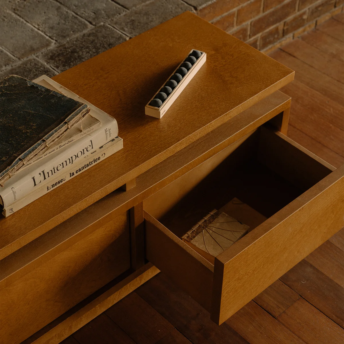 Het Ratio lowboard combineert royale opbergruimte met een zwevend ontwerp. Het is gemaakt van MDF, berkenfineer en massief berkenhout in een warmbruine kleur en maakt indruk met zijn fijne houtnerf en hoogwaardige afwerking. Drie push-to-open lades op geruisloze soft-close rails bieden voldoende ruimte voor alledaagse voorwerpen, terwijl het open, verborgen vak aan de bovenkant van de console subtiele lichtheid toevoegt. Met zijn heldere, evenwichtige vorm past het Ratio lowboard harmonieus in zowel moderne als klassieke interieurs.