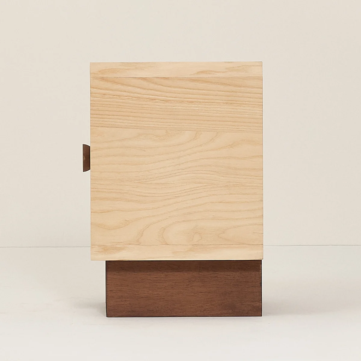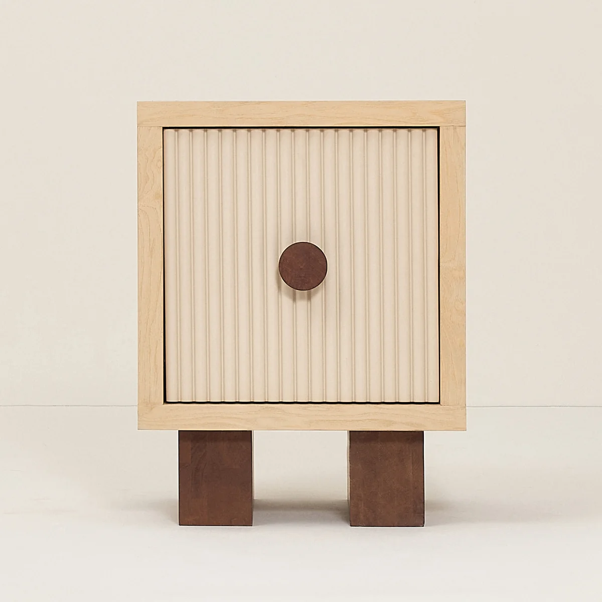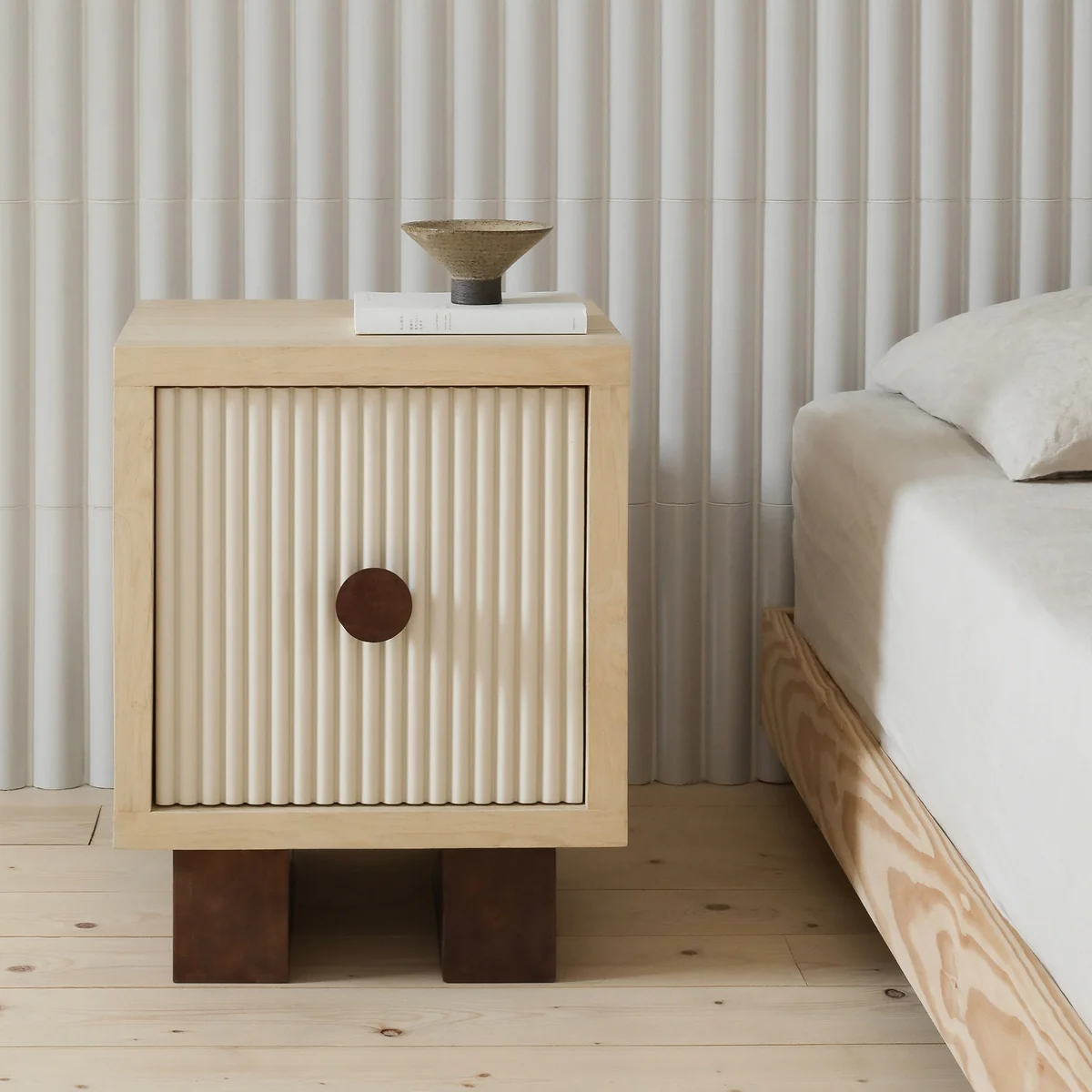 Het gegroefde oppervlak van de deur nodigt kinderen uit om spelenderwijs texturen te ontdekken, terwijl de afgeronde, contrastrijke handgreep niet alleen makkelijk vast te pakken is, maar ook veilig en kindvriendelijk. De poten van het nachtkastje, geïnspireerd op traditionele Japanse geta sandalen, geven het meubel een licht, zwevend karakter.