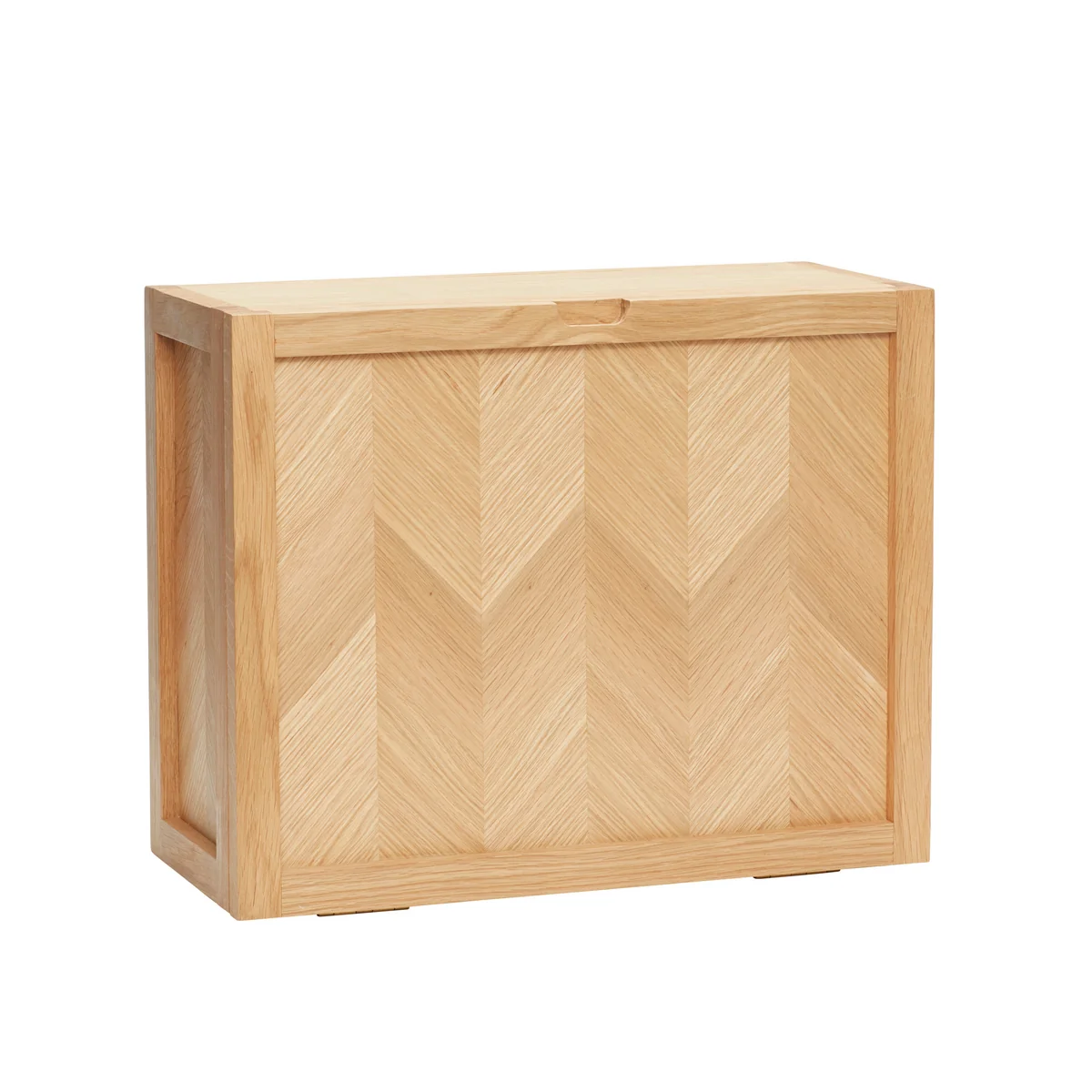 Deze schoenenkast van Hübsch Interior roept met zijn subtiele visgraatmotief een elegante, Scandinavische flair op in de gang. Achter het scharnierende front verbergt zich voldoende opbergruimte voor meerdere paar schoenen en aan de bovenzijde kunnen decoratieve figuren of portemonnee worden gepresenteerd en kunnen sleutels worden opgeborgen.
