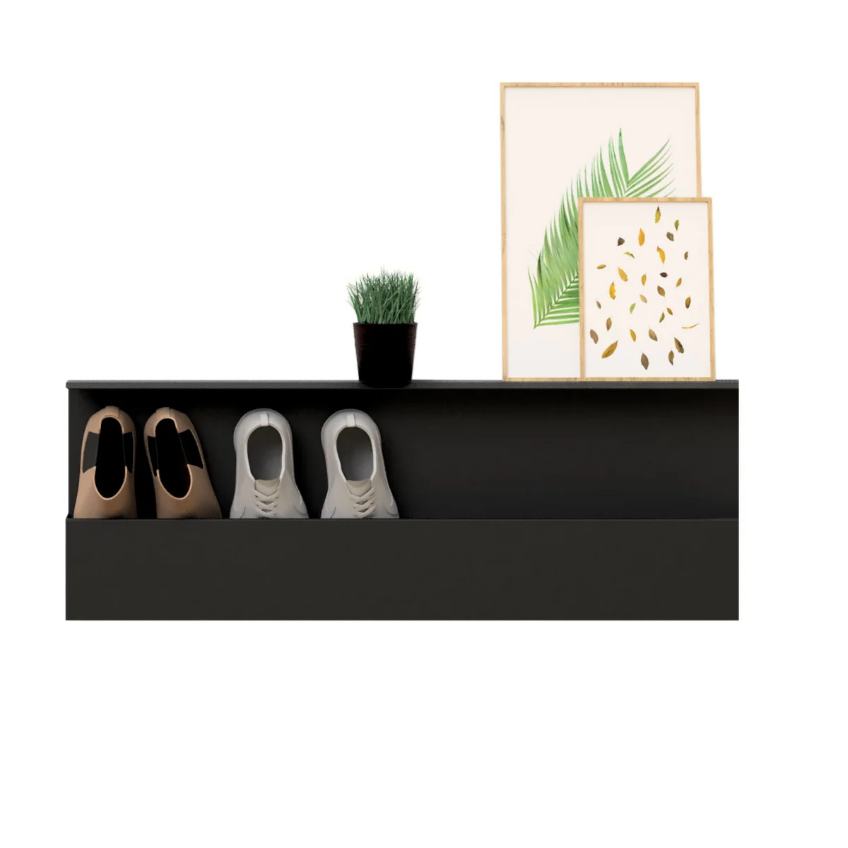Doordat de schoenen in het rek boven de vloer hangen, wordt de ingang of de hal optisch geopend, zodat niet alleen lichtheid de kamer vult, maar ook het stofzuigen gemakkelijker wordt. De Shoe Box is verkrijgbaar in drie verschillende maten en biedt plaats aan 2 (50 cm) of 4 (100 cm) paar schoenen. Bovendien kan het stijlvolle schoenenrek uitstekend worden gecombineerd met andere garderobe- en opbergmeubelen van Nichba Design .