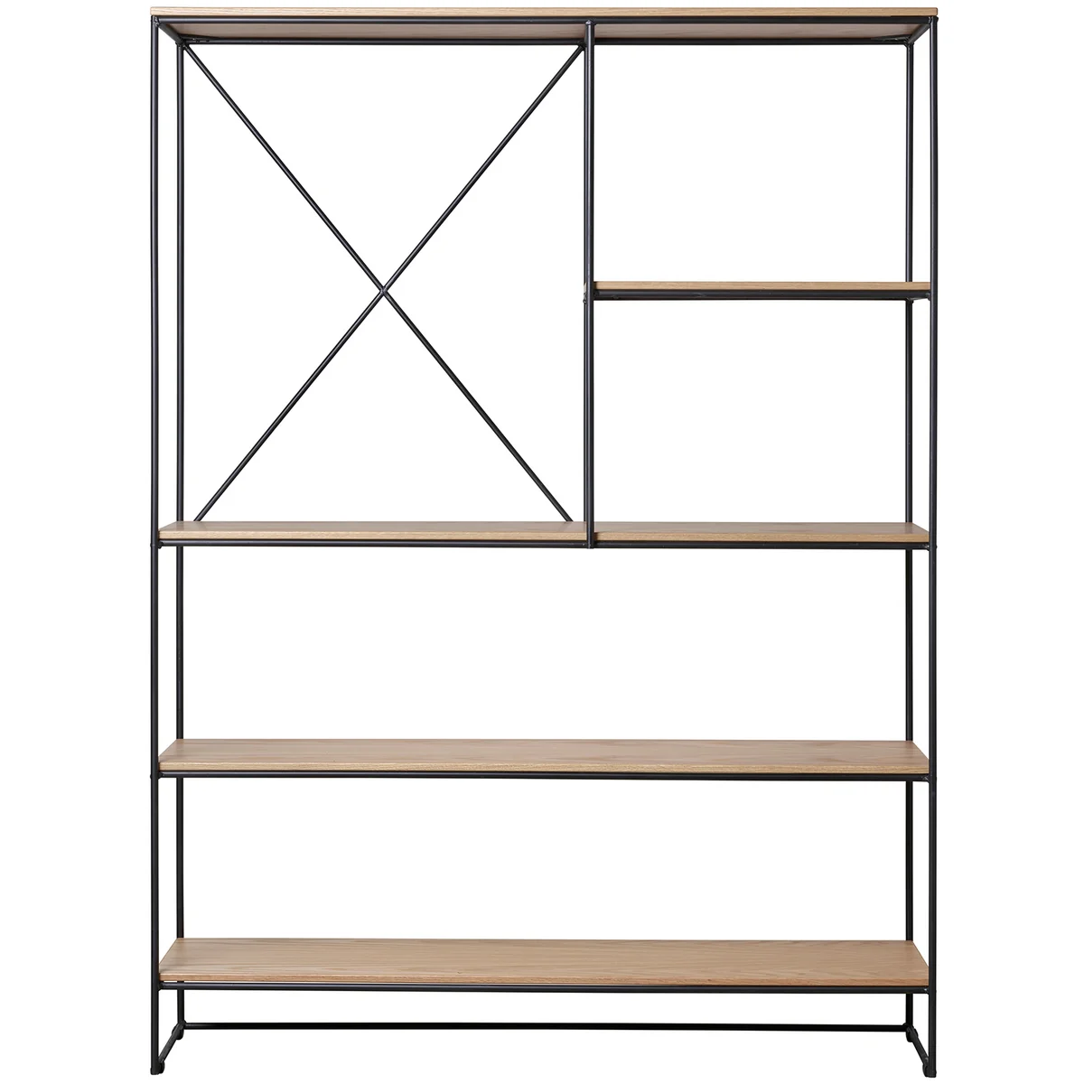 De op Bauhaus geïnspireerde plank bestaat uit een gepoedercoat stalen frame met een matte afwerking. De verbindingen zijn met de hand gelast en licht afgerond voor een zachte indruk. Diagonaal geplaatste stangen bieden extra ondersteuning en geven de indruk van dynamiek. De planken zijn gemaakt van eikenfineer met afgeschuinde randen die naadloos overgaan in het frame.