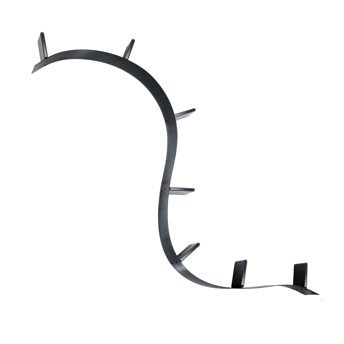 Bookworm is verkrijgbaar in verschillende lengtes en wordt geleverd met een reeks boekensteunen. Deze zeer speciale stelling combineert flexibiliteit met een groot draagvermogen en is zonder aarzeling bestand tegen een belasting van ongeveer 10 kg op elk element. Het is raadzaam om de planken in een bocht aan de wand te bevestigen om materiaalspanning te creëren en het draagvermogen te vergroten.