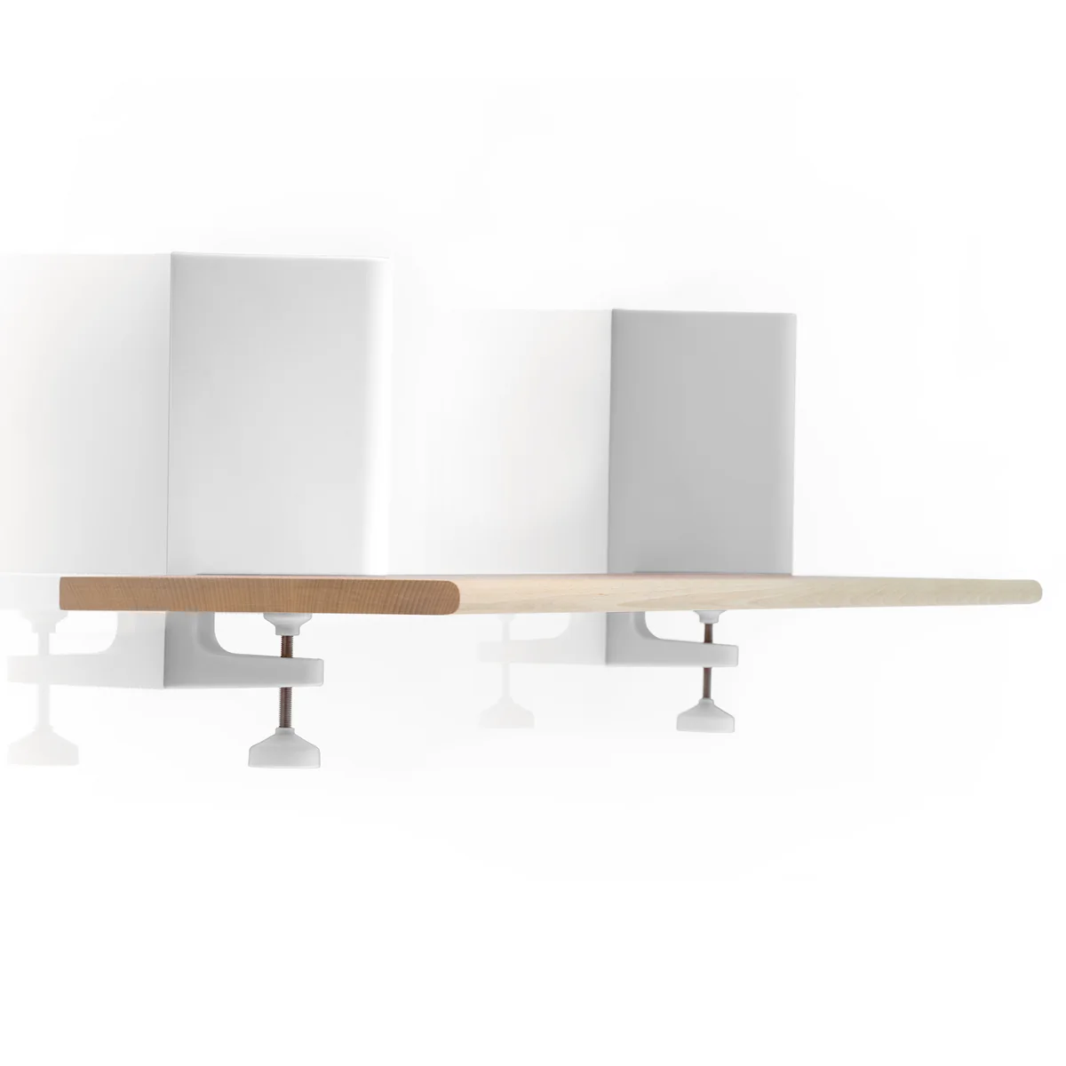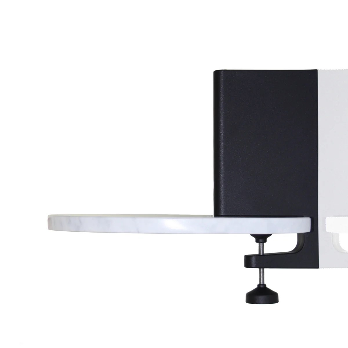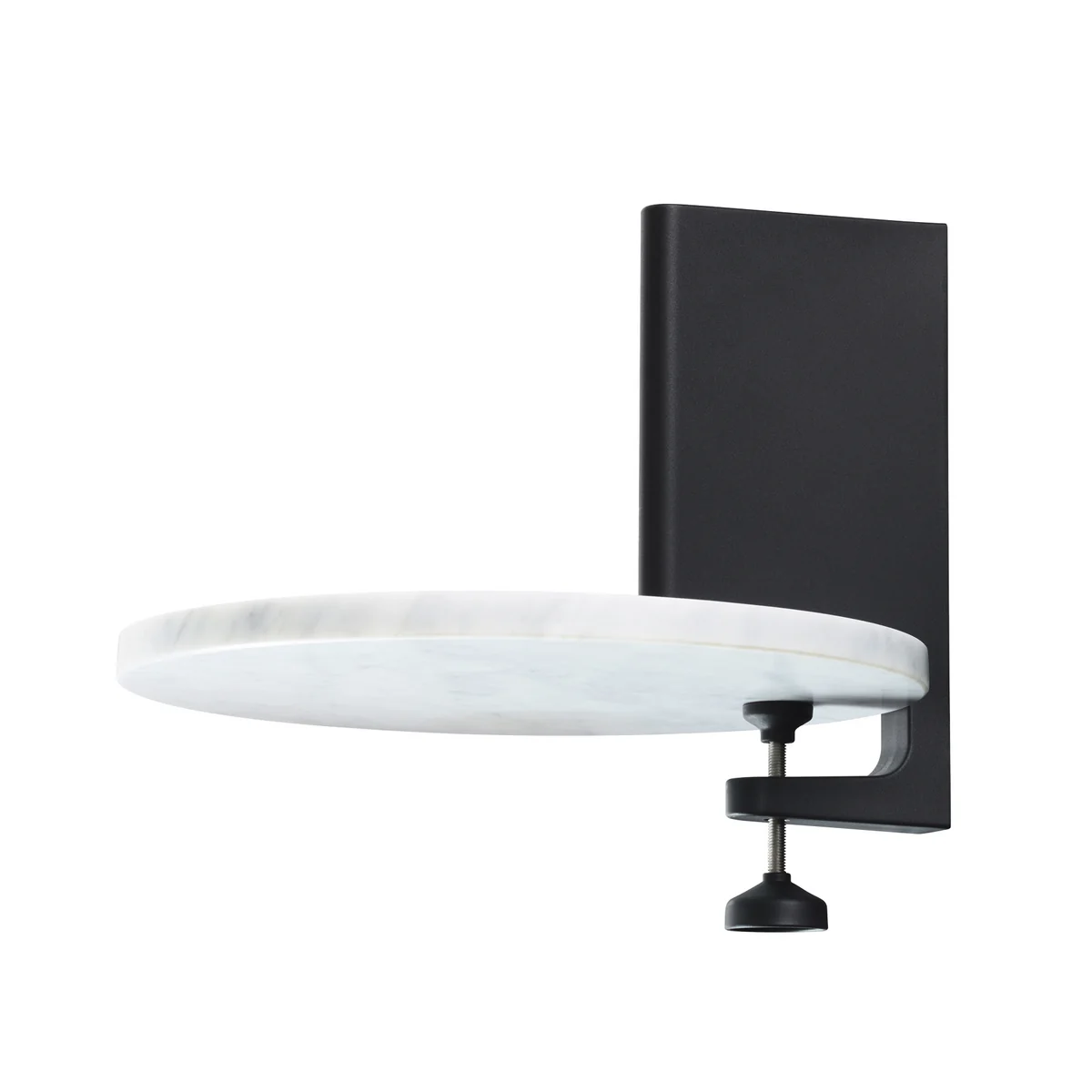 De klemmensteun van glasvezelversterkt polypropyleen is in staat om verschillende platen vast te klemmen die eenvoudigweg tussen de vice-achtige steun worden geklemd. Verschillende platen (uit staal of beukenhout) onthullen de industriële oorsprong van Spike, die met zijn draagvermogen van 40 kg een praktische helper is. Het ronde legbord van marmer zou de edele uitgave vertegenwoordigen.
