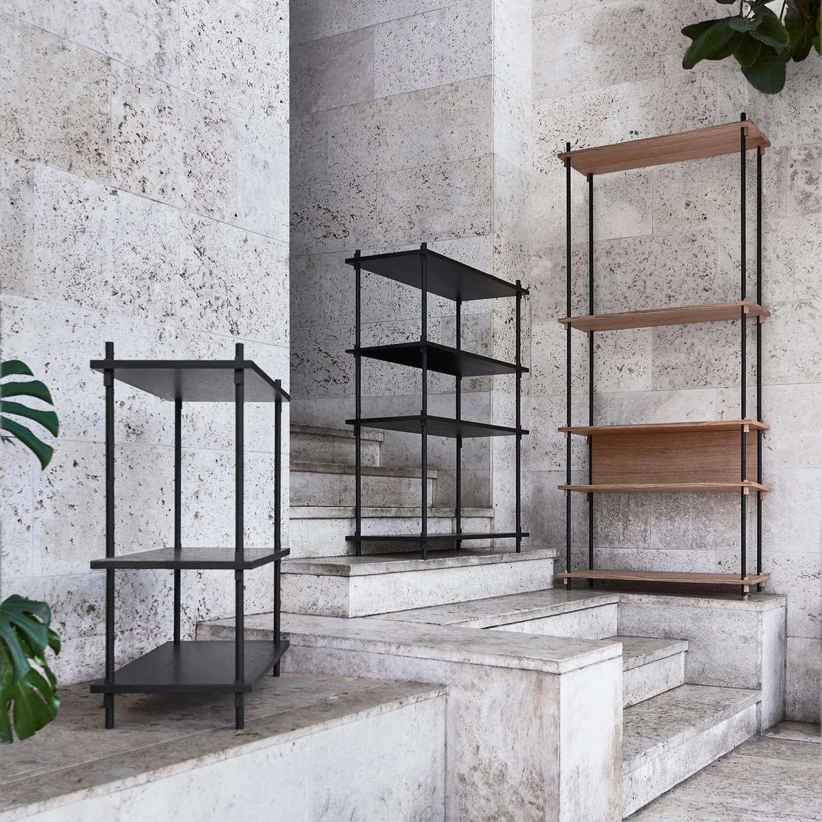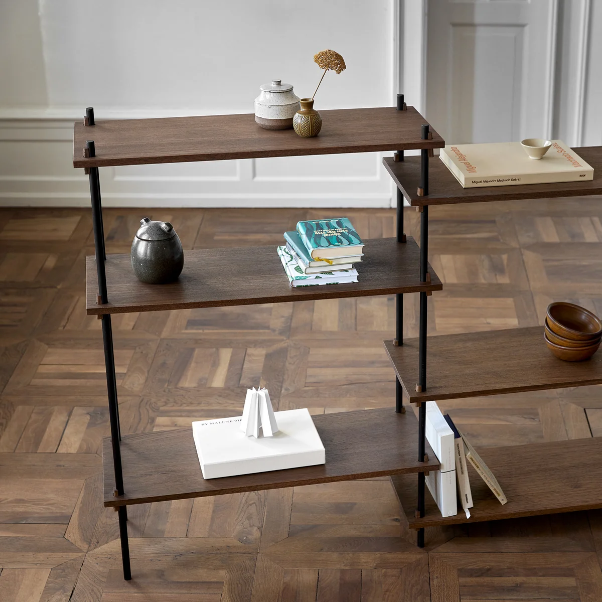 De planken zijn gemaakt van MDF-platen met eikenfineer in verschillende variaties, terwijl het frame is gemaakt van staal met poedercoating. De planken, die hier al zijn voorgeconfigureerd, kunnen naar wens worden uitgebreid om een systeem te creëren dat volledig aan de persoonlijke behoeften voldoet.