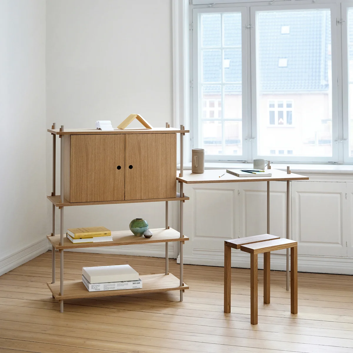 De Shelving System van Moebe is een uitbreidbaar rekkensysteem waarvoor helemaal geen schroeven of lijm nodig is. Het concept is gebaseerd op eenvoudige, intelligente wigvormige verbindingen die de afzonderlijke elementen zonder gereedschap betrouwbaar bij elkaar houden. Bovendien geeft het gebruik van wiggen als verbindingsstuk de gebruiker de volledige vrijheid om de rekken naar eigen wens vorm te geven, de rekken in elke gewenste stand te plaatsen en aan te passen aan specifieke behoeften.