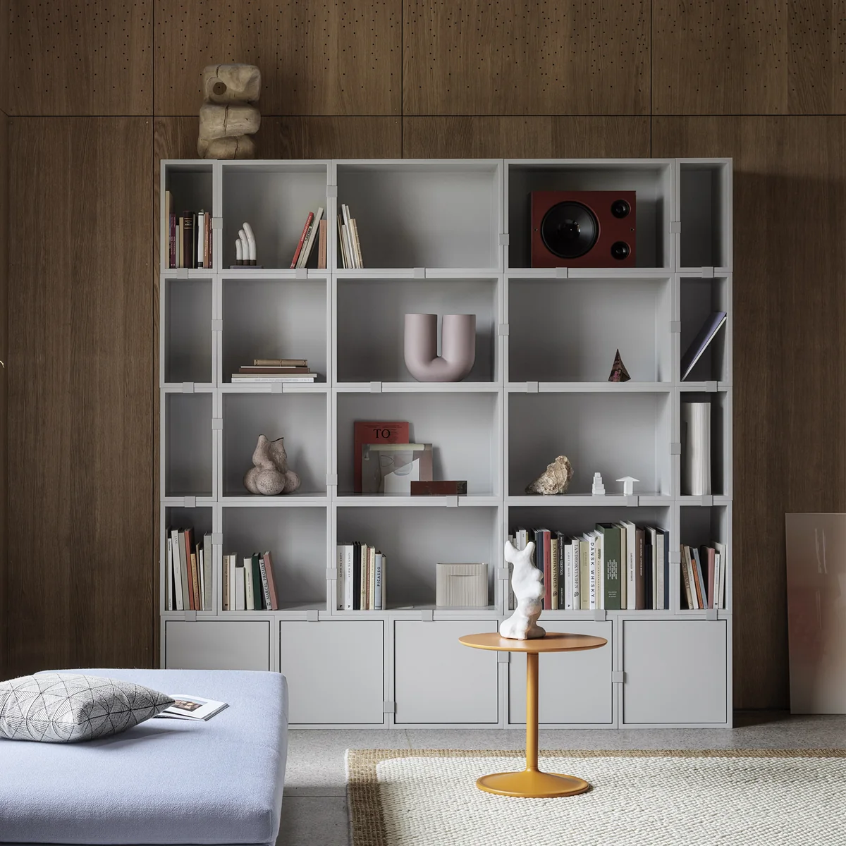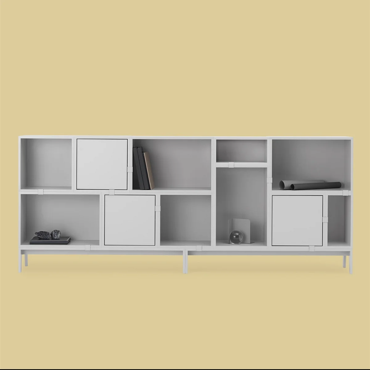 De modules van de Stacked rekken in de lichtgrijze versie van Muuto zijn verkrijgbaar met of zonder achterwanden. Bovendien is er een Stacked serie wordt geleverd met een podium dat kan worden gebruikt om de individuele Stacked onderdelen kunnen worden verhoogd, bijvoorbeeld om een dressoir te creëren.