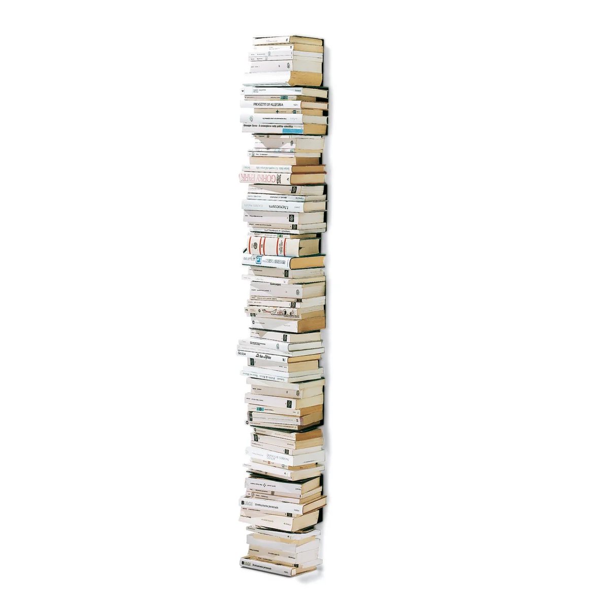 De originele Ptolomeo wandboekenkast van Opinion Ciatti maakt een boekenberging mogelijk op slanke wanden en daarmee op plaatsen waar gemeenschappelijke wandplanken geen ruimte hebben.