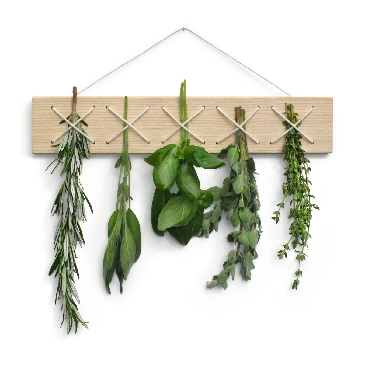 Gemaakt van onbehandeld hout en voorzien van een natuurlijk gekleurd rubberen koord van biologisch katoen en natuurlijk rubber, kunnen bundels veilig en luchtig ondersteboven worden opgehangen. Kruiden behouden hun smaak en bloemen of grassen drogen bijzonder gelijkmatig. Dankzij het flexibele koord is het ophangen en verwisselen van de planten snel en eenvoudig.