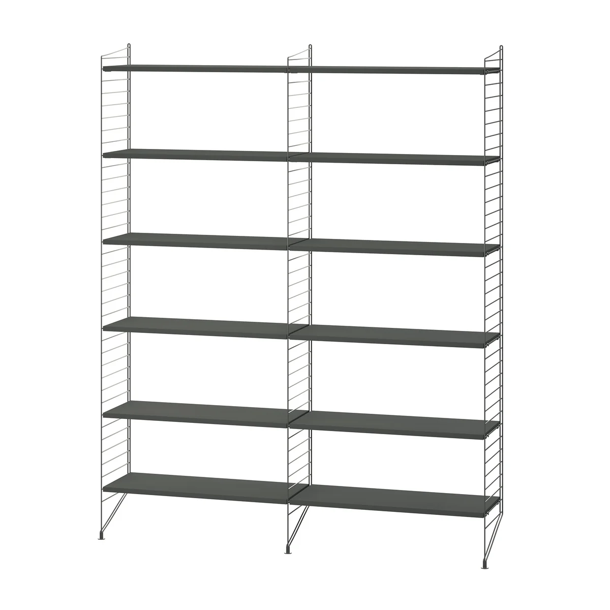 String De legbordcombinatie uit biedt een flexibel en modern opbergsysteem dat ideaal is voor woon- en werkruimtes. Voorgeconfigureerd met drie stevige vloerladders en 12 robuuste legplanken, biedt het veel opbergruimte en optimale organisatie. Het heldere, eigentijdse ontwerp en de hoogwaardige afwerking garanderen duurzaamheid en veelzijdige aanpassingsmogelijkheden voor individuele ruimteconcepten. Dankzij het modulaire ontwerp kan het rekkensysteem flexibel worden uitgebreid en perfect worden geïntegreerd in verschillende omgevingen, waardoor het zowel een stijlvol inrichtingselement als een functionele opbergoplossing is.