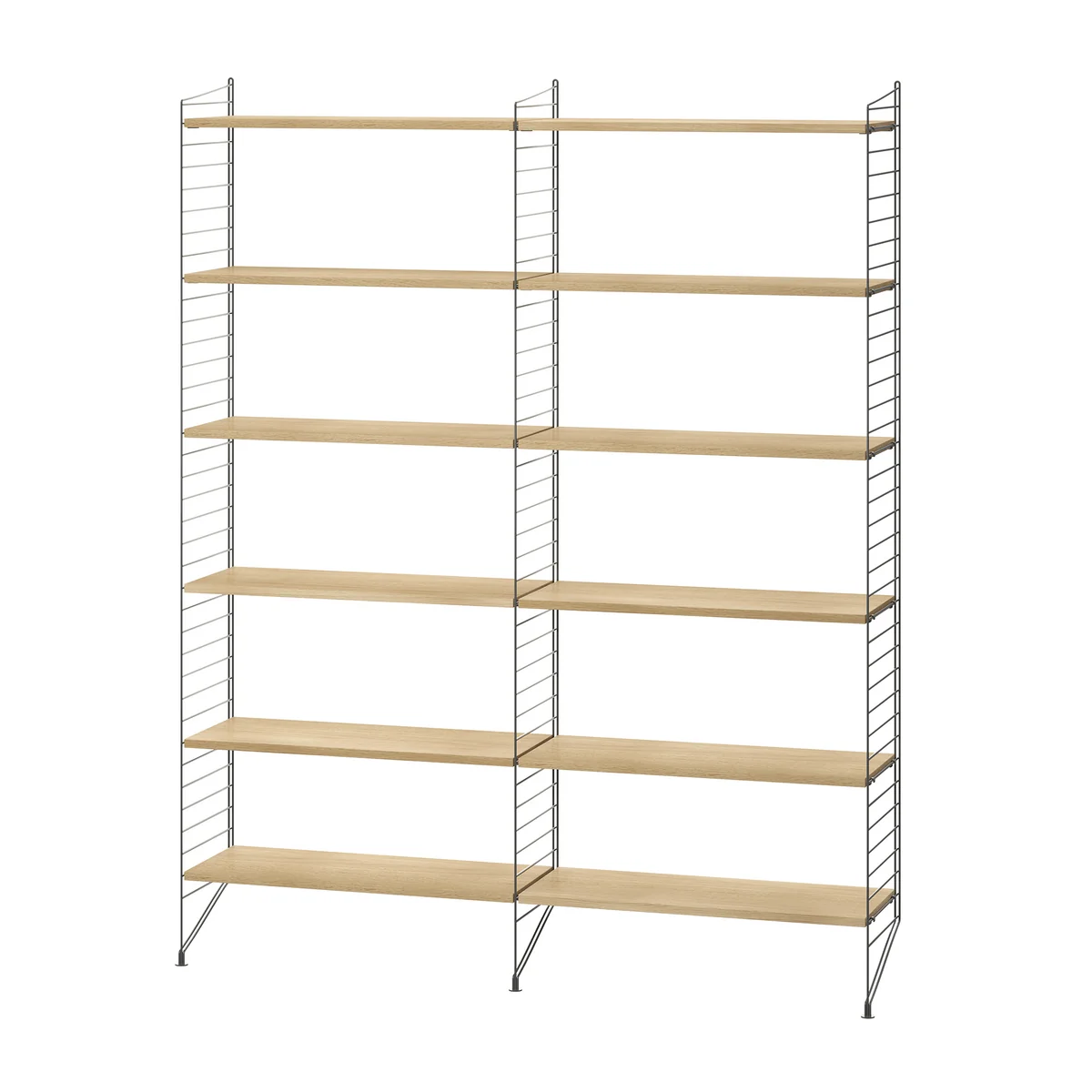 String De legbordcombinatie uit biedt een flexibel en modern opbergsysteem dat ideaal is voor woon- en werkruimtes. Voorgeconfigureerd met drie stevige vloerladders en 12 robuuste legplanken, biedt het veel opbergruimte en optimale organisatie. Het heldere, eigentijdse ontwerp en de hoogwaardige afwerking garanderen duurzaamheid en veelzijdige aanpassingsmogelijkheden voor individuele ruimteconcepten. Dankzij het modulaire ontwerp kan het rekkensysteem flexibel worden uitgebreid en perfect worden geïntegreerd in verschillende omgevingen, waardoor het zowel een stijlvol inrichtingselement als een functionele opbergoplossing is.