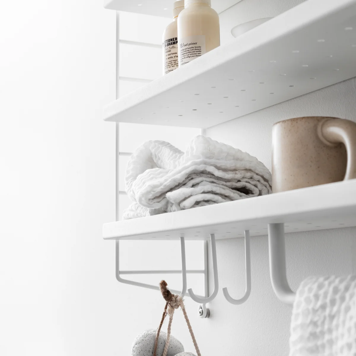 Er zijn bijpassende praktische haken verkrijgbaar, die ook aan de onderkant van de plank kunnen worden gebruikt.