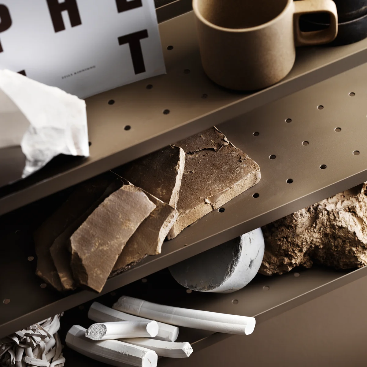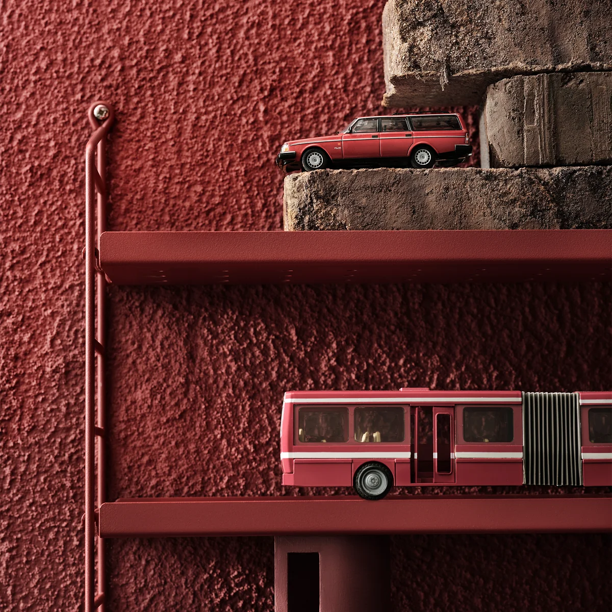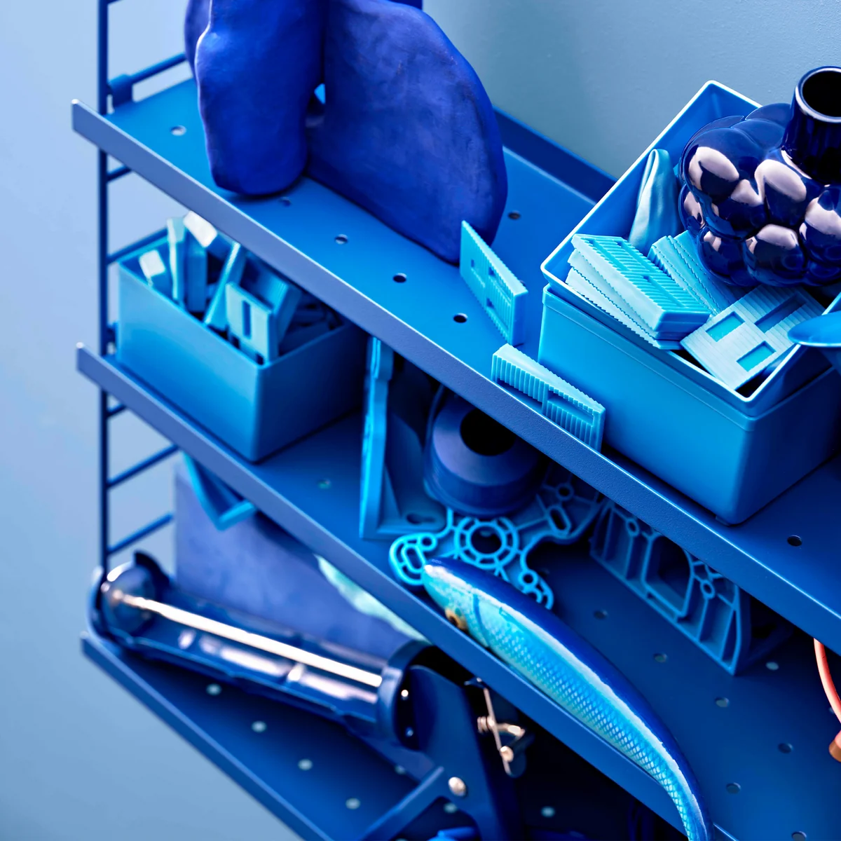 De String Pocket plank is nu ook verkrijgbaar in metaal in zowel subtiele en tijdloze als opvallende neonkleuren. Volledig gemaakt van metaal en met praktische geperforeerde planken, kan de compacte metalen plank niet alleen in de kinderkamer of woonkamer worden opgehangen, maar is ook geweldig voor gebruik in de keuken of badkamer.