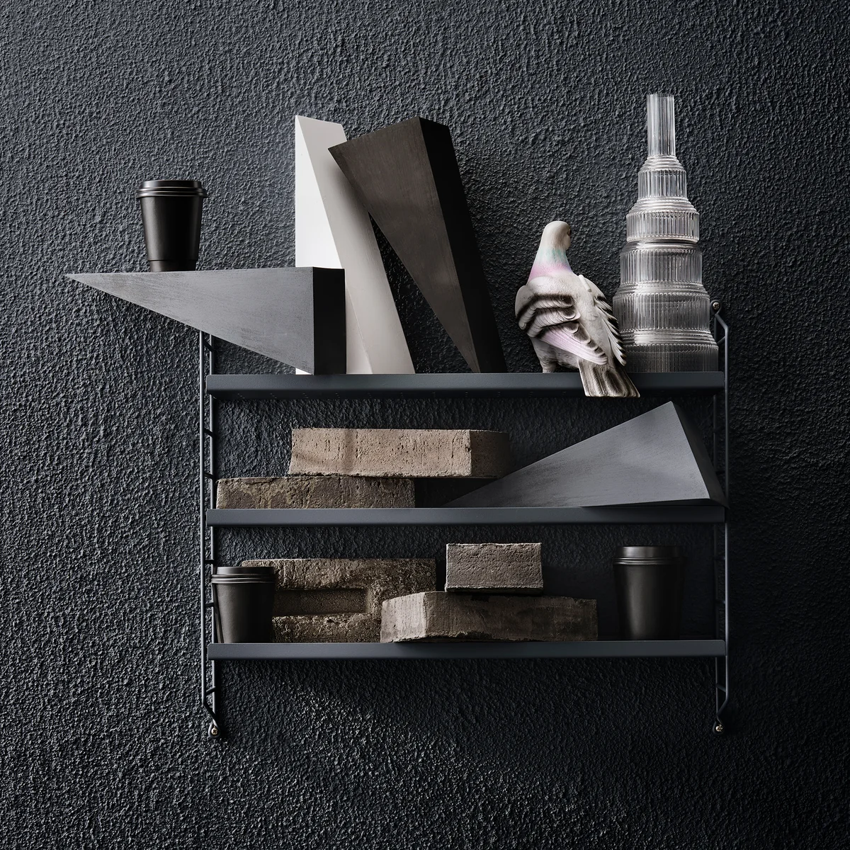 De String Pocket plank kan worden gecombineerd met andere planken en kan zowel naar boven als naar opzij worden uitgeschoven. Voor deze plank zijn geen vloerladders verkrijgbaar. De levering omvat twee zijelementen voor wandmontage en drie bijpassende legplanken.