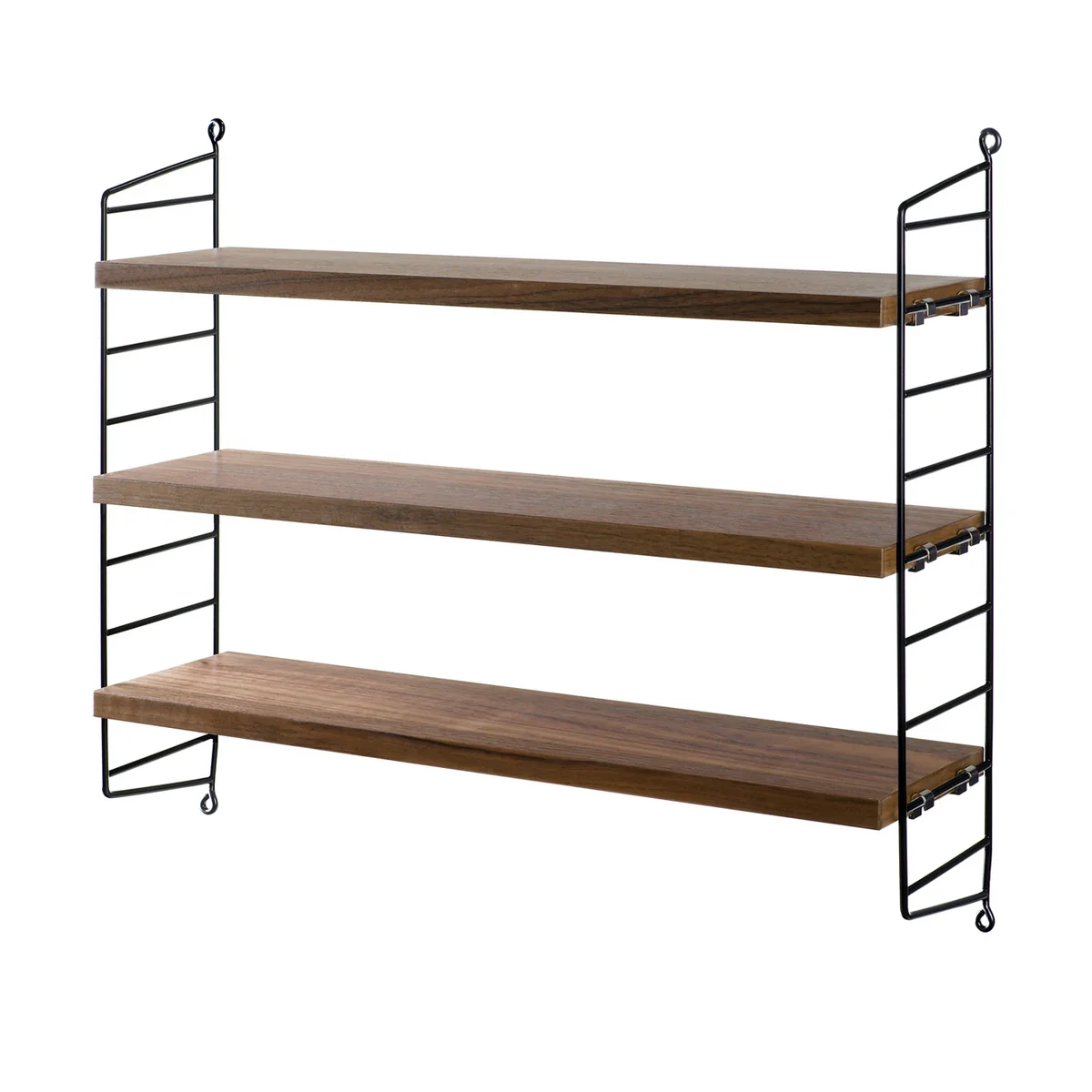 De String Pocket schap van Nisse Strinning kan worden gecombineerd met andere schappen en kan zowel naar boven als naar de zijkant worden uitgeschoven. Vloerladders zijn niet verkrijgbaar voor deze stelling. De levering omvat twee zijelementen voor wandmontage en drie bijpassende legplanken.